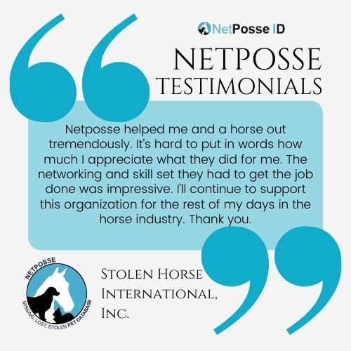 When my horse, Bullet, was stolen in July, I was advised by several people to reach out to NetPosse. Upon reaching out to them, Debi Metcalfe immediately contacted me and began implementing a plan for getting Bullet’s information into the hands of as many people and organizations as possible. Not only did I receive the information I needed to get Bullet back, but I also received the support I needed to help cope with the crisis I was in. Debi and her colleagues were so supportive and understanding. After about four weeks, Bullet was recovered and I am one hundred percent confident that it was all because of the efforts NetPosse put into making flyers and generating publicity to bring attention to Bullet’s situation. Without NetPosse, I truly do not believe Bullet would ever been returned to his home. Role: Client Served Comment link: https://greatnonprofits.org/user/profile/886579
