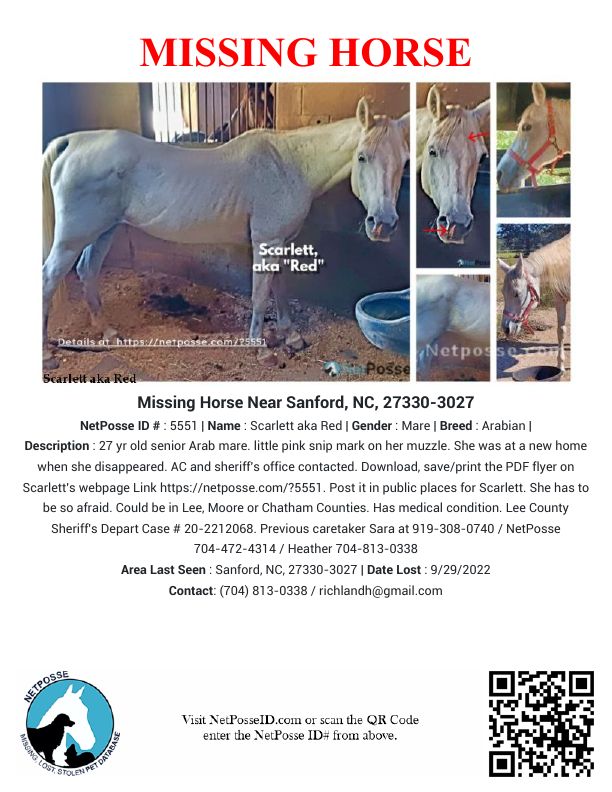 Description: Scarlett, aka Red, went missing from Sanford, NC sometime between September 28th - September 29th. There are multiple parties involved in the search for the 27 year old senior Arab, who is underweight due to a medical condition. She has a blaze under her forelock, where the top looks like the top of a heart. Look at the pictures to see more. Animal control and sheriff's office already contacted. She could be in Lee, Moore or Chatham Counties. Has medical condition. Reported to Lee County Sheriff's Department Case # 20-2212068 At this point we are not sure if she just got out or if she was helped out. Keep an eye out for her not only in the three counties but also at kill pens, horse auctions, online trading and sales groups and more. Right now we are are exploring every possibility. Contact 704-472-4314