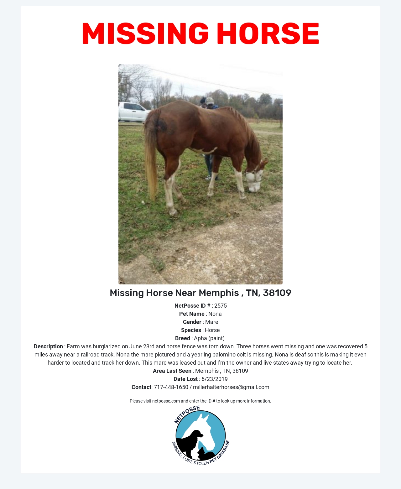 Description: Farm was burglarized on June 23rd and horse fence was torn down. Three horses went missing and one was recovered 5 miles away near a railroad track. Nona the mare pictured and a yearling palomino colt is missing. Nona is deaf so this is making it even harder to located and track her down. This mare was leased out and I’m the owner and live states away trying to locate her.