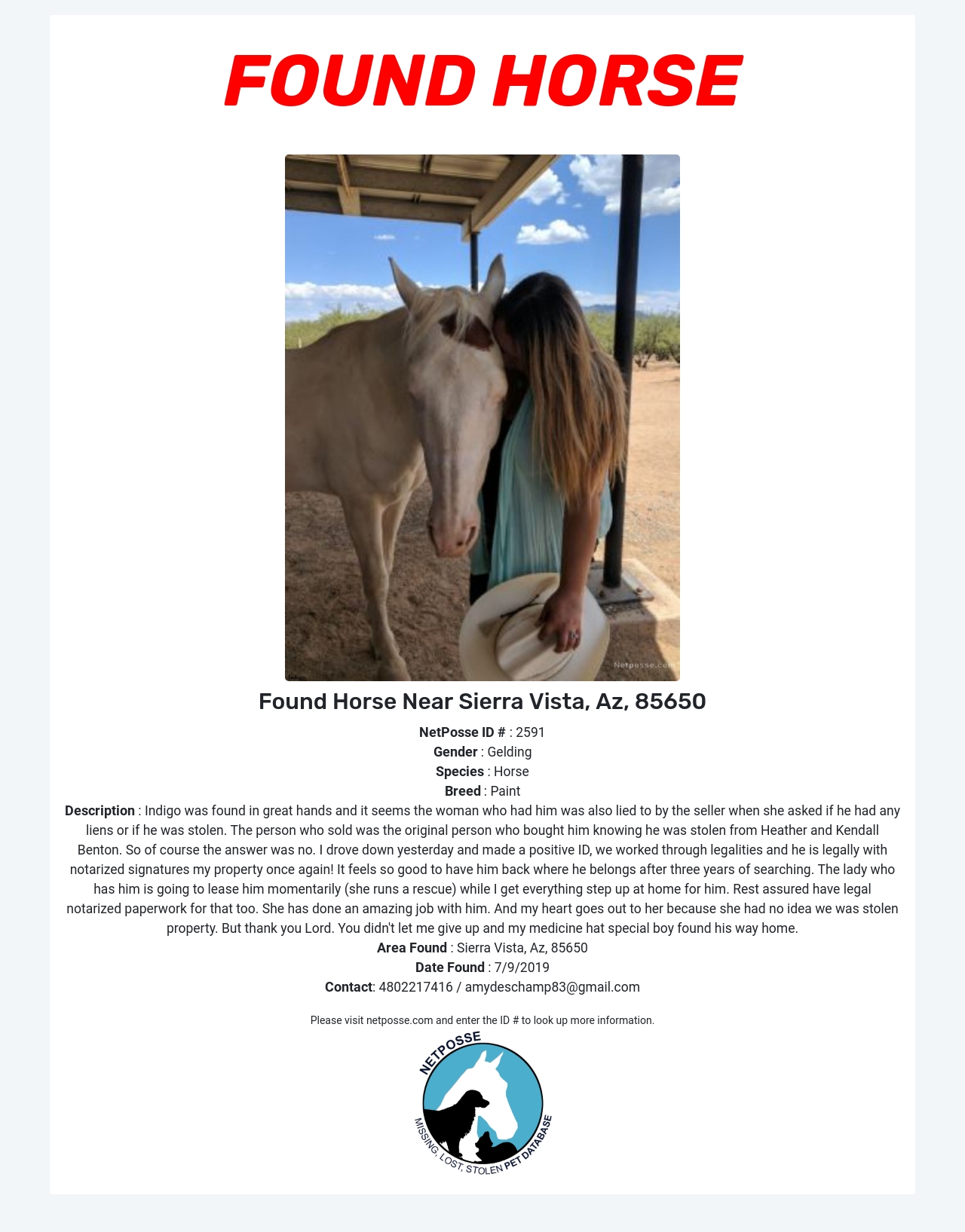 Description: Indigo was found in great hands and it seems the woman who had him was also lied to by the seller when she asked if he had any liens or if he was stolen. The person who sold was the original person who bought him knowing he was stolen from Heather and Kendall Benton. So of course the answer was no. I drove down yesterday and made a positive ID, we worked through legalities and he is legally with notarized signatures my property once again! It feels so good to have him back where he belongs after three years of searching. The lady who has him is going to lease him momentarily (she runs a rescue) while I get everything step up at home for him. Rest assured have legal notarized paperwork for that too. She has done an amazing job with him. And my heart goes out to her because she had no idea we was stolen property. But thank you Lord. You didn't let me give up and my medicine hat special boy found his way home.