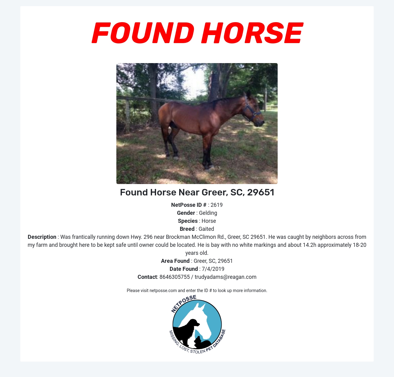 Description: Was frantically running down Hwy. 296 near Brockman McClimon Rd., Greer, SC 29651. He was caught by neighbors across from my farm and brought here to be kept safe until owner could be located. He is bay with no white markings and about 14.2h approximately 18-20 years old.