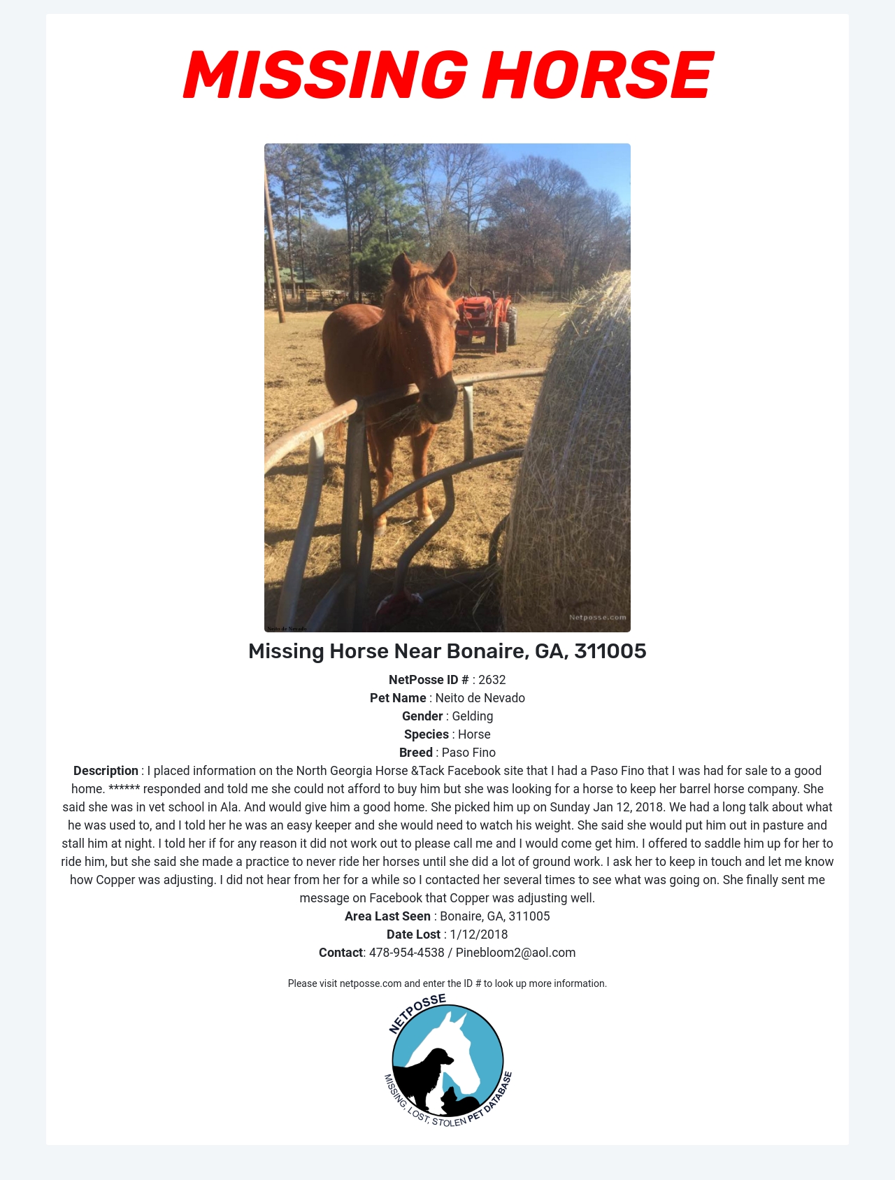 Description: I placed information on the North Georgia Horse &Tack Facebook site that I had a Paso Fino that I was had for sale to a good home. ****** responded and told me she could not afford to buy him but she was looking for a horse to keep her barrel horse company. She said she was in vet school in Ala. And would give him a good home. She picked him up on Sunday Jan 12, 2018. We had a long talk about what he was used to, and I told her he was an easy keeper and she would need to watch his weight. She said she would put him out in pasture and stall him at night. I told her if for any reason it did not work out to please call me and I would come get him. I offered to saddle him up for her to ride him, but she said she made a practice to never ride her horses until she did a lot of ground work. I ask her to keep in touch and let me know how Copper was adjusting. I did not hear from her for a while so I contacted her several times to see what was going on. She finally sent me message on Facebook that Copper was adjusting well.