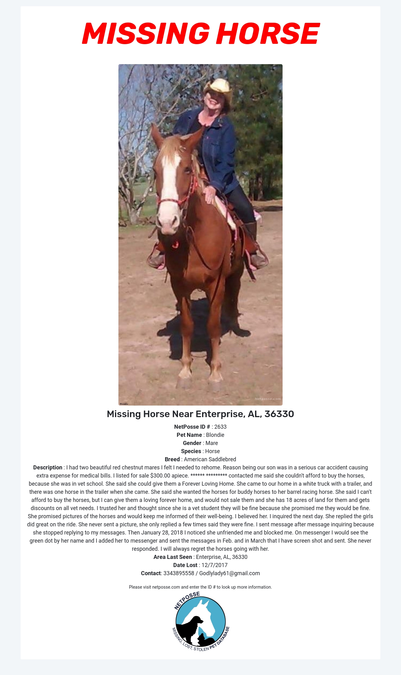Description: I had two beautiful red chestnut mares I felt I needed to rehome. Reason being our son was in a serious car accident causing extra expense for medical bills. I listed for sale $300.00 apiece. ****** ********* contacted me said she couldn't afford to buy the horses, because she was in vet school. She said she could give them a Forever Loving Home. She came to our home in a white truck with a trailer, and there was one horse in the trailer when she came. She said she wanted the horses for buddy horses to her barrel racing horse. She said I can't afford to buy the horses, but I can give them a loving forever home, and would not sale them and she has 18 acres of land for them and gets discounts on all vet needs. I trusted her and thought since she is a vet student they will be fine because she promised me they would be fine. She promised pictures of the horses and would keep me informed of their well-being. I believed her. I inquired the next day. She replied the girls did great on the ride. She never sent a picture, she only replied a few times said they were fine. I sent message after message inquiring because she stopped replying to my messages. Then January 28, 2018 I noticed she unfriended me and blocked me. On messenger I would see the green dot by her name and I added her to messenger and sent the messages in Feb. and in March that I have screen shot and sent. She never responded. I will always regret the horses going with her.