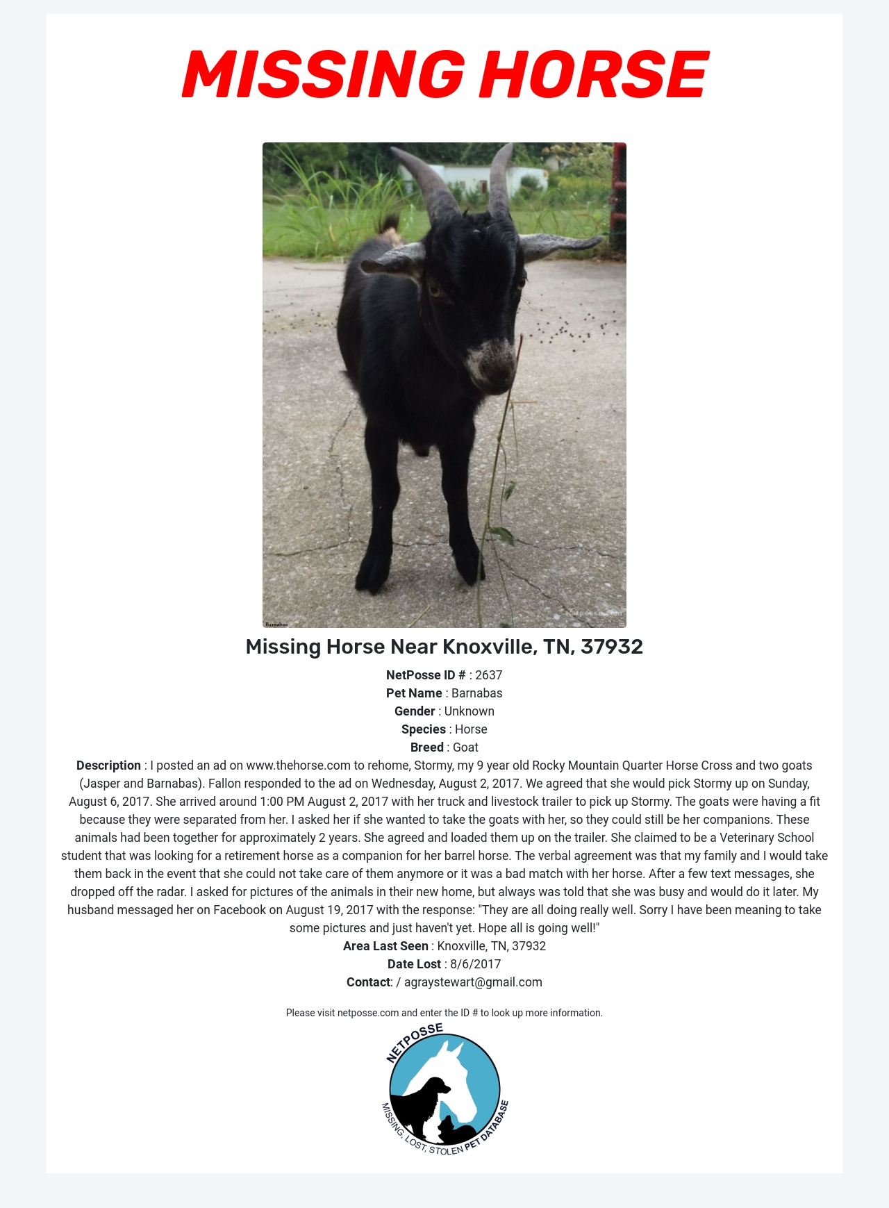 Description: I posted an ad on www.thehorse.com to rehome, Stormy, my 9 year old Rocky Mountain Quarter Horse Cross and two goats (Jasper and Barnabas). Fallon responded to the ad on Wednesday, August 2, 2017. We agreed that she would pick Stormy up on Sunday, August 6, 2017. She arrived around 1:00 PM August 2, 2017 with her truck and livestock trailer to pick up Stormy. The goats were having a fit because they were separated from her. I asked her if she wanted to take the goats with her, so they could still be her companions. These animals had been together for approximately 2 years. She agreed and loaded them up on the trailer. She claimed to be a Veterinary School student that was looking for a retirement horse as a companion for her barrel horse. The verbal agreement was that my family and I would take them back in the event that she could not take care of them anymore or it was a bad match with her horse. After a few text messages, she dropped off the radar. I asked for pictures of the animals in their new home, but always was told that she was busy and would do it later. My husband messaged her on Facebook on August 19, 2017 with the response: "They are all doing really well. Sorry I have been meaning to take some pictures and just haven't yet. Hope all is going well!"