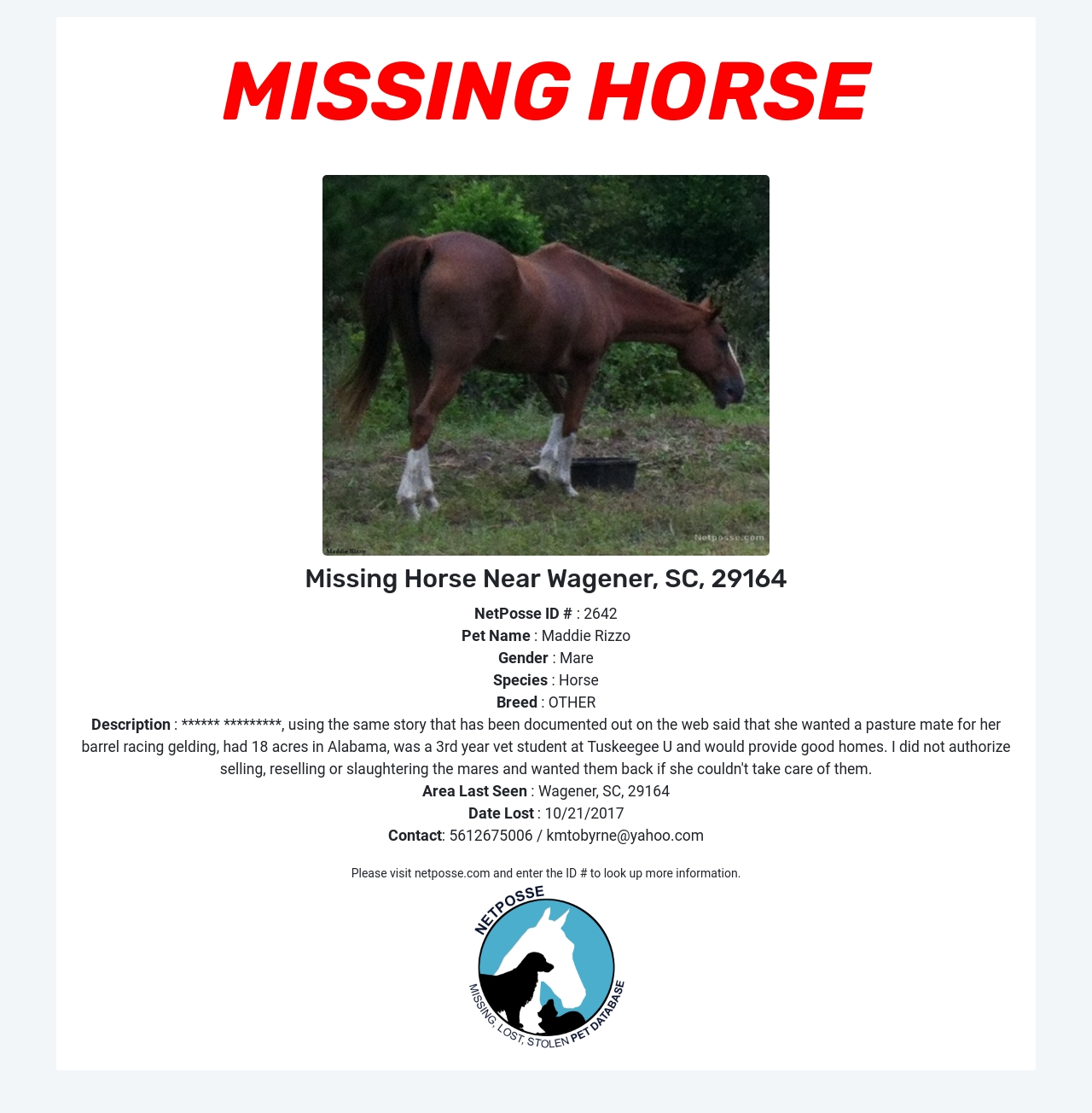 Description: ****** *********, using the same story that has been documented out on the web said that she wanted a pasture mate for her barrel racing gelding, had 18 acres in Alabama, was a 3rd year vet student at Tuskeegee U and would provide good homes. I did not authorize selling, reselling or slaughtering the mares and wanted them back if she couldn't take care of them.
