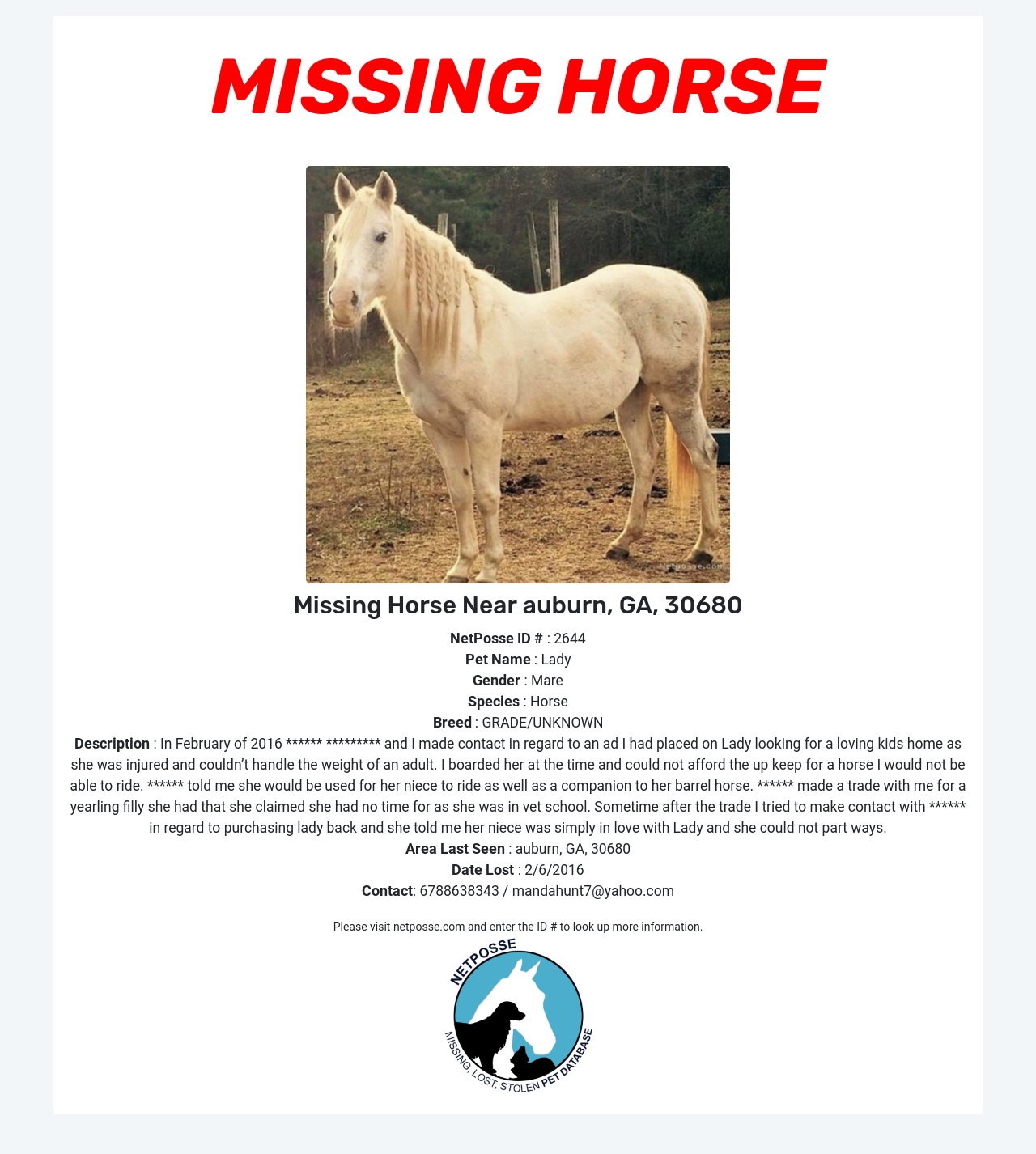 Description: In February of 2016 ****** ********* and I made contact in regard to an ad I had placed on Lady looking for a loving kids home as she was injured and couldn’t handle the weight of an adult. I boarded her at the time and could not afford the up keep for a horse I would not be able to ride. ****** told me she would be used for her niece to ride as well as a companion to her barrel horse. ****** made a trade with me for a yearling filly she had that she claimed she had no time for as she was in vet school. Sometime after the trade I tried to make contact with ****** in regard to purchasing lady back and she told me her niece was simply in love with Lady and she could not part ways.