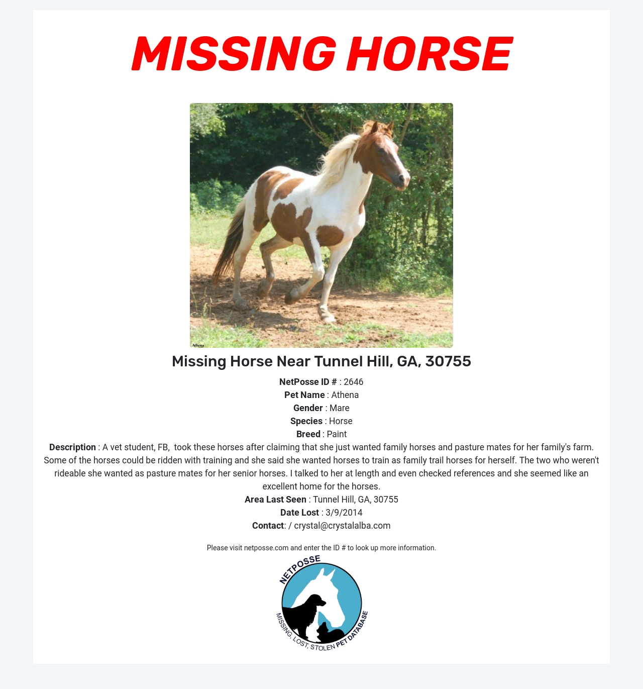 Description: A vet student, FB, took these horses after claiming that she just wanted family horses and pasture mates for her family's farm. Some of the horses could be ridden with training and she said she wanted horses to train as family trail horses for herself. The two who weren't rideable she wanted as pasture mates for her senior horses. I talked to her at length and even checked references and she seemed like an excellent home for the horses.