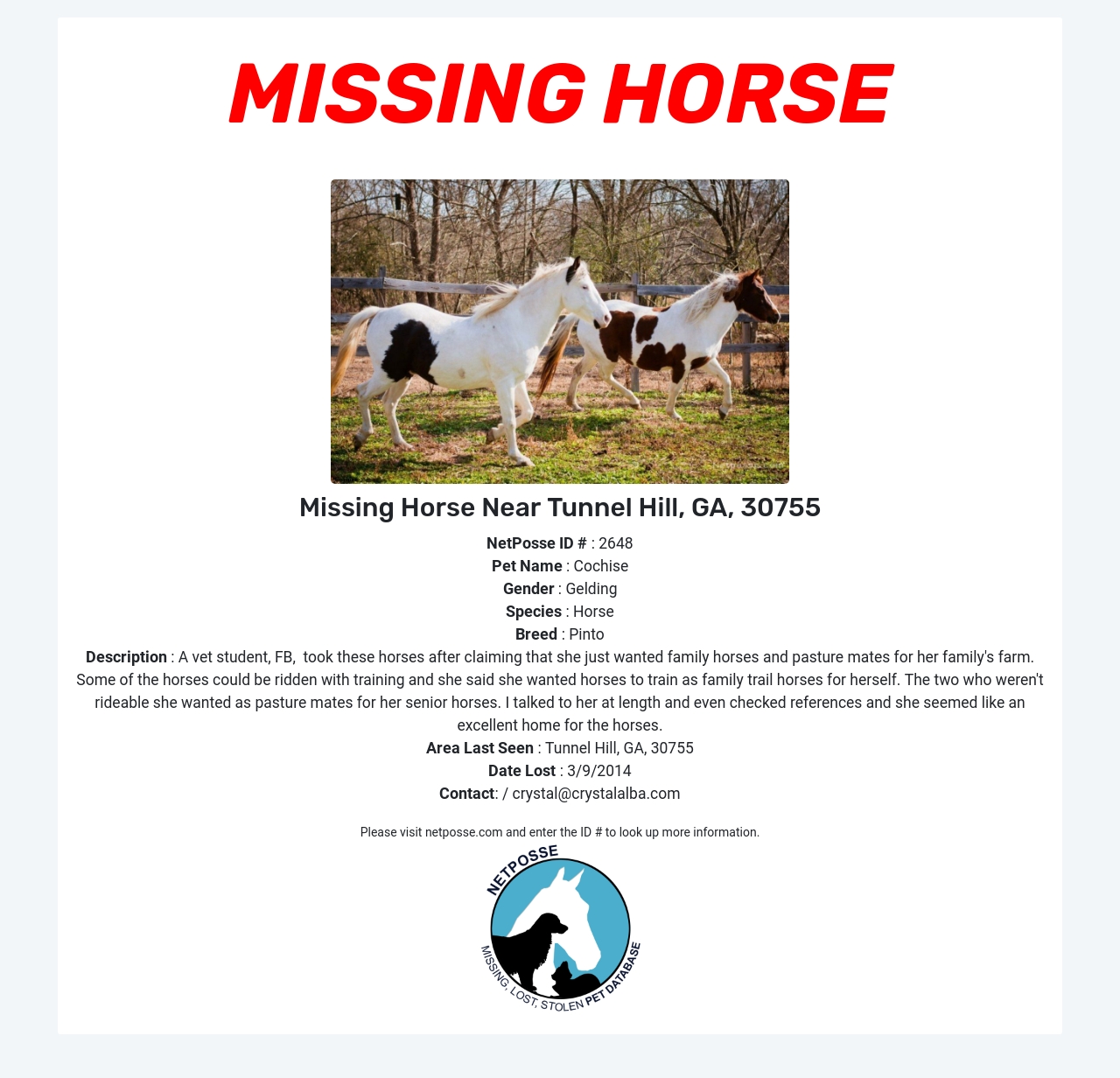 Description: A vet student, FB, took these horses after claiming that she just wanted family horses and pasture mates for her family's farm. Some of the horses could be ridden with training and she said she wanted horses to train as family trail horses for herself. The two who weren't rideable she wanted as pasture mates for her senior horses. I talked to her at length and even checked references and she seemed like an excellent home for the horses.