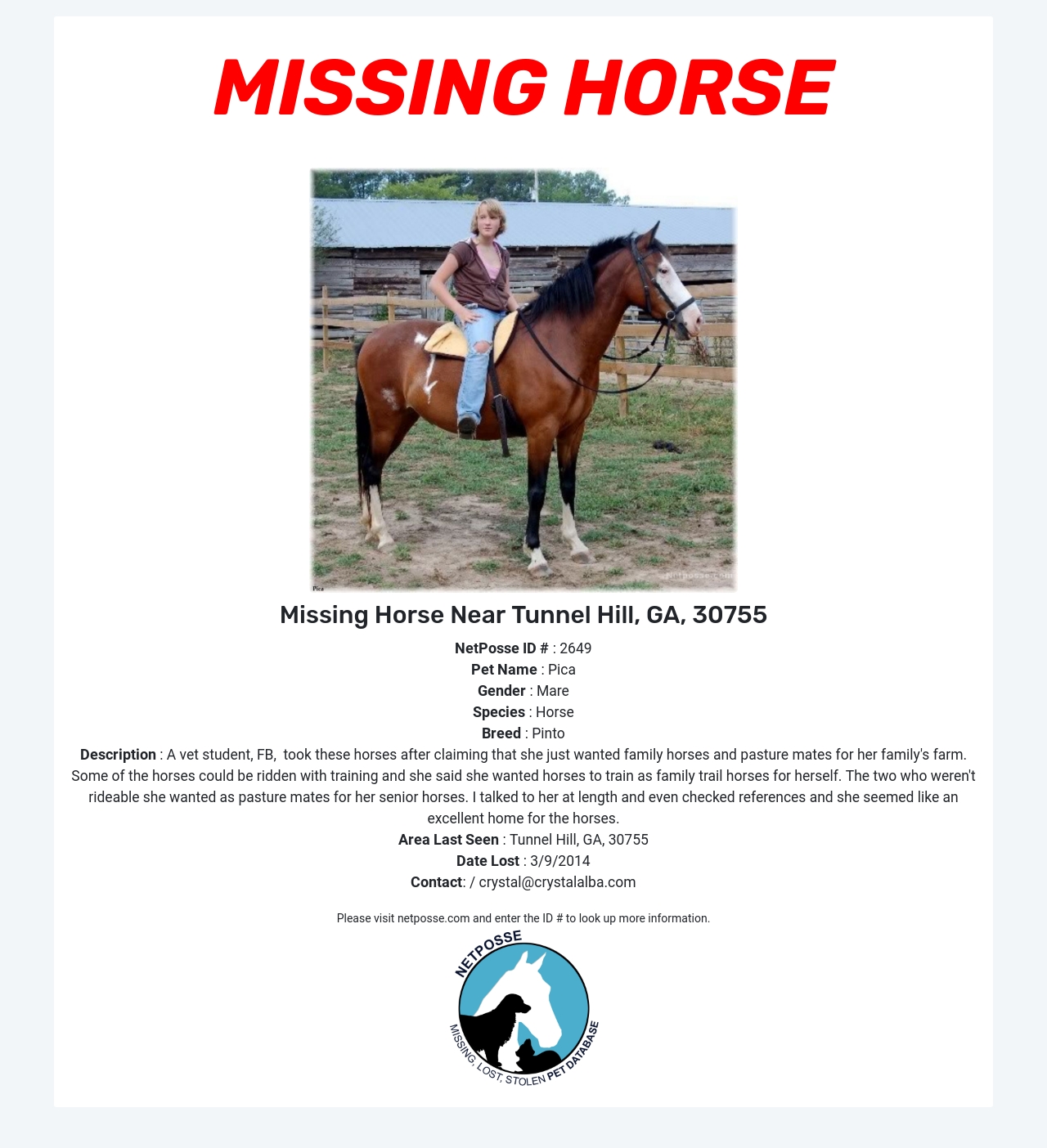 Description: A vet student, FB, took these horses after claiming that she just wanted family horses and pasture mates for her family's farm. Some of the horses could be ridden with training and she said she wanted horses to train as family trail horses for herself. The two who weren't rideable she wanted as pasture mates for her senior horses. I talked to her at length and even checked references and she seemed like an excellent home for the horses.