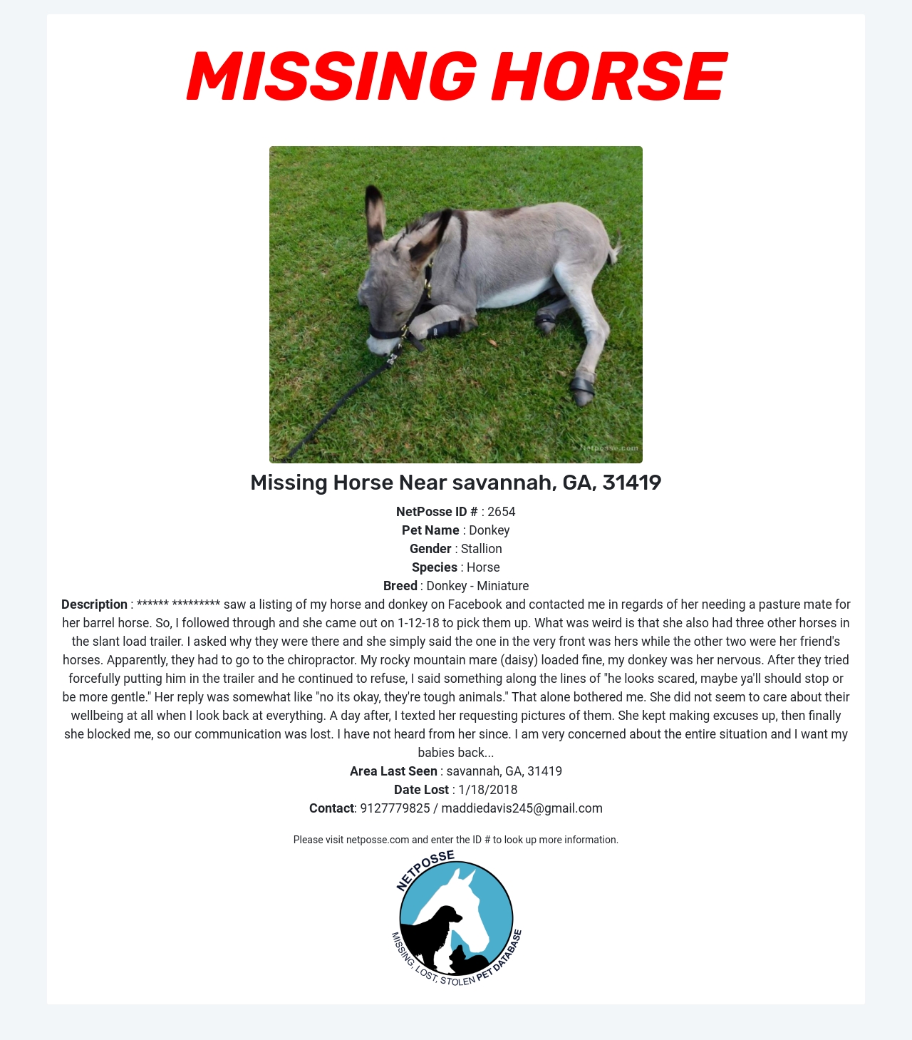 Description: ****** ********* saw a listing of my horse and donkey on Facebook and contacted me in regards of her needing a pasture mate for her barrel horse. So, I followed through and she came out on 1-12-18 to pick them up. What was weird is that she also had three other horses in the slant load trailer. I asked why they were there and she simply said the one in the very front was hers while the other two were her friend's horses. Apparently, they had to go to the chiropractor. My rocky mountain mare (daisy) loaded fine, my donkey was her nervous. After they tried forcefully putting him in the trailer and he continued to refuse, I said something along the lines of "he looks scared, maybe ya'll should stop or be more gentle." Her reply was somewhat like "no its okay, they're tough animals." That alone bothered me. She did not seem to care about their wellbeing at all when I look back at everything. A day after, I texted her requesting pictures of them. She kept making excuses up, then finally she blocked me, so our communication was lost. I have not heard from her since. I am very concerned about the entire situation and I want my babies back...
