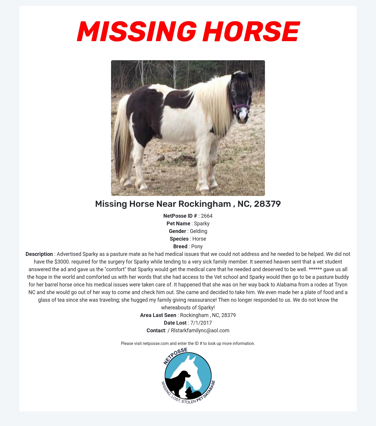 Description: Advertised Sparky as a pasture mate as he had medical issues that we could not address and he needed to be helped. We did not have the $3000. required for the surgery for Sparky while tending to a very sick family member. It seemed heaven sent that a vet student answered the ad and gave us the "comfort" that Sparky would get the medical care that he needed and deserved to be well. ****** gave us all the hope in the world and comforted us with her words that she had access to the Vet school and Sparky would then go to be a pasture buddy for her barrel horse once his medical issues were taken care of. It happened that she was on her way back to Alabama from a rodeo at Tryon NC and she would go out of her way to come and check him out. She came and decided to take him. We even made her a plate of food and a glass of tea since she was traveling; she hugged my family giving reassurance! Then no longer responded to us. We do not know the whereabouts of Sparky!