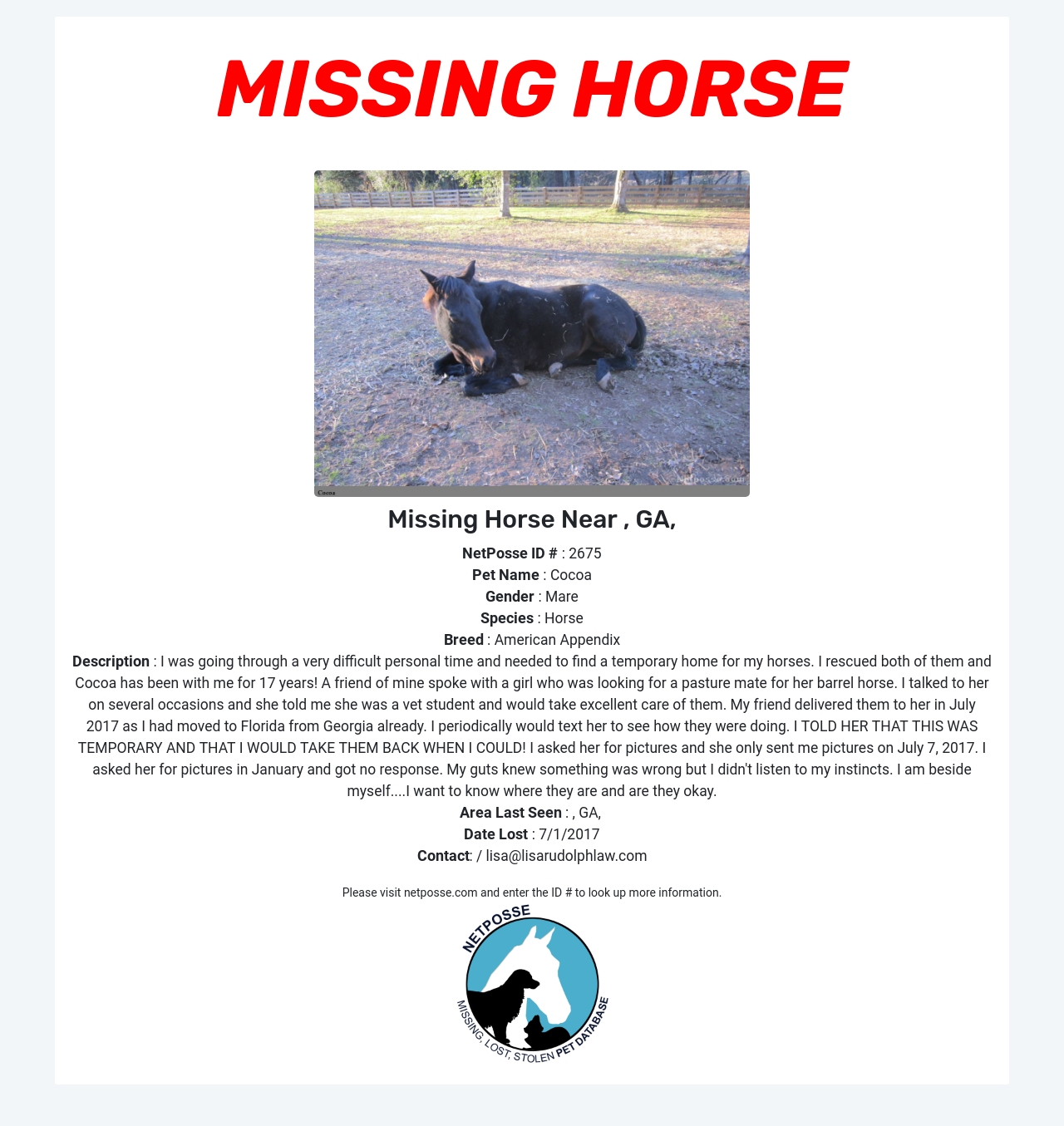 Description: I was going through a very difficult personal time and needed to find a temporary home for my horses. I rescued both of them and Cocoa has been with me for 17 years! A friend of mine spoke with a girl who was looking for a pasture mate for her barrel horse. I talked to her on several occasions and she told me she was a vet student and would take excellent care of them. My friend delivered them to her in July 2017 as I had moved to Florida from Georgia already. I periodically would text her to see how they were doing. I TOLD HER THAT THIS WAS TEMPORARY AND THAT I WOULD TAKE THEM BACK WHEN I COULD! I asked her for pictures and she only sent me pictures on July 7, 2017. I asked her for pictures in January and got no response. My guts knew something was wrong but I didn't listen to my instincts. I am beside myself....I want to know where they are and are they okay.
