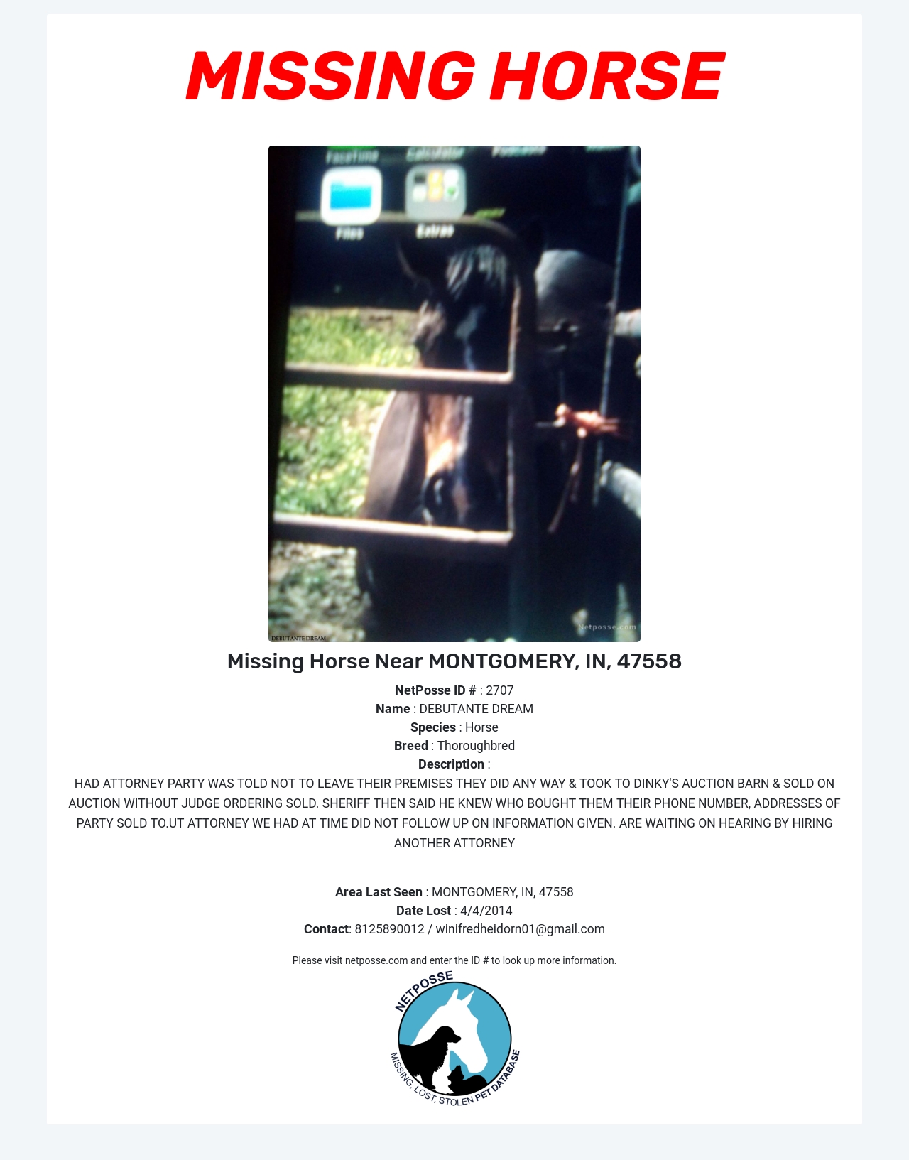 Description: HAD ATTORNEY PARTY WAS TOLD NOT TO LEAVE THEIR PREMISES THEY DID ANY WAY & TOOK TO DINKY'S AUCTION BARN & SOLD ON AUCTION WITHOUT JUDGE ORDERING SOLD. SHERIFF THEN SAID HE KNEW WHO BOUGHT THEM THEIR PHONE NUMBER, ADDRESSES OF PARTY SOLD TO.UT ATTORNEY WE HAD AT TIME DID NOT FOLLOW UP ON INFORMATION GIVEN. ARE WAITING ON HEARING BY HIRING ANOTHER ATTORNEY
