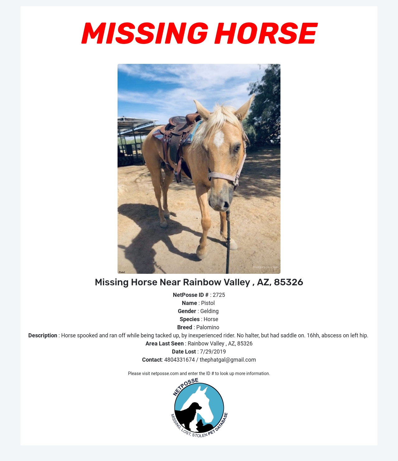 Description: AZ COLD CASE: The horse spooked and ran off while being tacked up by an inexperienced rider. The horse was not wearing a halter but had a saddle on. The horse is 16hh and has an abscess on the left hip.