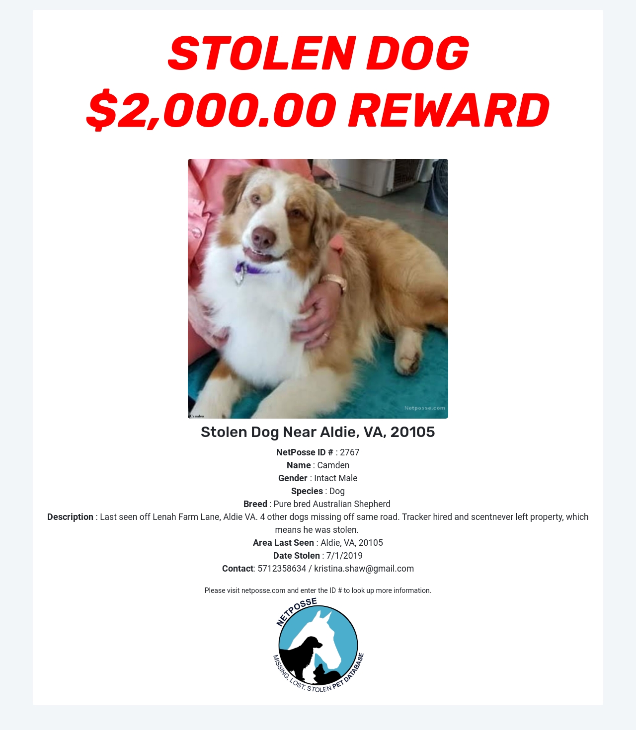 Description: Last seen off Lenah Farm Lane, Aldie VA. 4 other dogs missing off same road. Tracker hired and scentnever left property, which means he was stolen.
