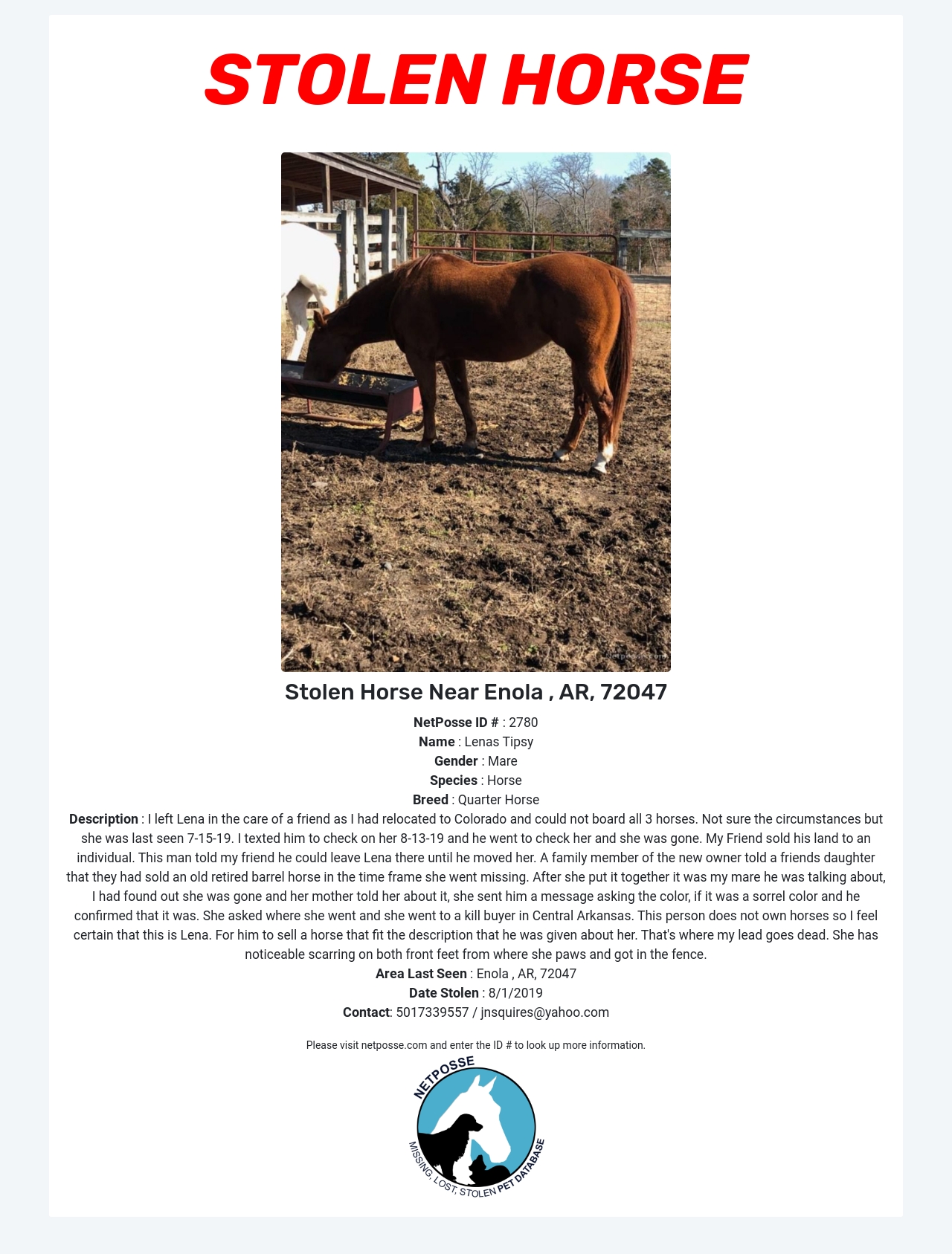 Description: I left Lena in the care of a friend as I had relocated to Colorado and could not board all 3 horses. Not sure the circumstances but she was last seen 7-15-19. I texted him to check on her 8-13-19 and he went to check her and she was gone. My Friend sold his land to an individual. This man told my friend he could leave Lena there until he moved her. A family member of the new owner told a friends daughter that they had sold an old retired barrel horse in the time frame she went missing. After she put it together it was my mare he was talking about, I had found out she was gone and her mother told her about it, she sent him a message asking the color, if it was a sorrel color and he confirmed that it was. She asked where she went and she went to a kill buyer in Central Arkansas. This person does not own horses so I feel certain that this is Lena. For him to sell a horse that fit the description that he was given about her. That's where my lead goes dead. She has noticeable scarring on both front feet from where she paws and got in the fence.