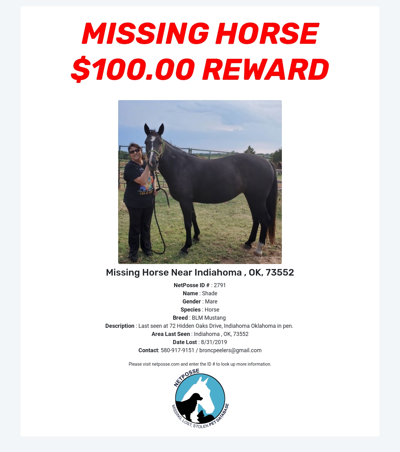 Description: Last seen at 72 Hidden Oaks Drive, Indiahoma Oklahoma in pen.