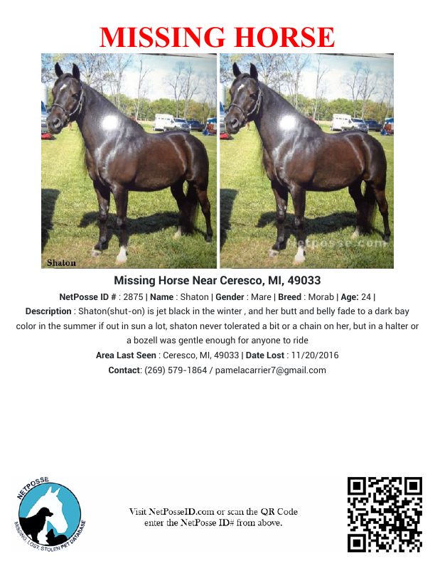 Description: I was searching for a family with children to rehome my 2 mares that I've had since birth, they would now be 20 years old, but were in excellent health and beautiful and gentle. I let them go to a home with a man and woman, and their children, to give a couple of weeks trial, and they were to only be returned to me if he could not keep them or it didn’t work out, they run numerous false ads on Craigslist wanting a couple of horses for his wife and children, even using a down syndrome child in his ads to give a forever home to spoil and love, mostly run these ads in Michigan, Ohio, Indiana. They use a their business for a front, also they come to your farm as a family and pull up with a trailer that they never mention bringing in our 3 conversations before arriving. They spent some time at the barn, asking all the right questions as if this was their first time owning horses. I was promised pics as soon as they were unloaded in their new stalls, but never received them. The next day I was feeling very uneasy, I was sent a couple of text responses then nothing, then finding out the address to the business in Ann Arbor did not exist, even though I googled it before he left with my girls, 3 days later he was found on Facebook, with a picture of a trailer and my horses in it, captioned 'last load of beef horses heading to the feed lot. 'I called police in Hillsdale county and they would not help me at all. Channel 3 news aired my story on December 6th ,2016. I had him stopped through social media for a couple months, and he filed a Personal Protection Order against me to leave him alone. I had a hearing set finally after 15 months for Friday April 13th, but he had it postponed claiming he was in the hospital. Please, If you have seen me horses, I need to know where they are!