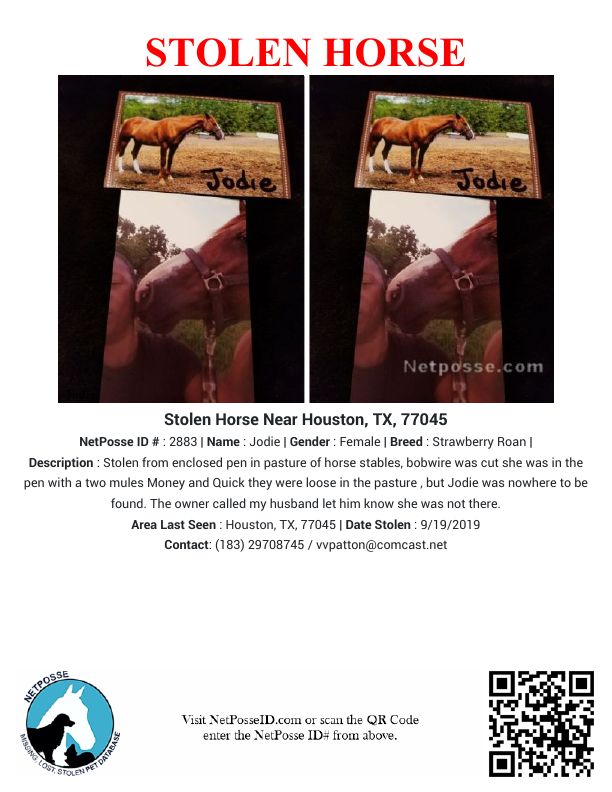 Description: Stolen from enclosed pen in pasture of horse stables, bobwire was cut she was in the pen with a two mules Money and Quick they were loose in the pasture , but Jodie was nowhere to be found. The owner called my husband let him know she was not there.