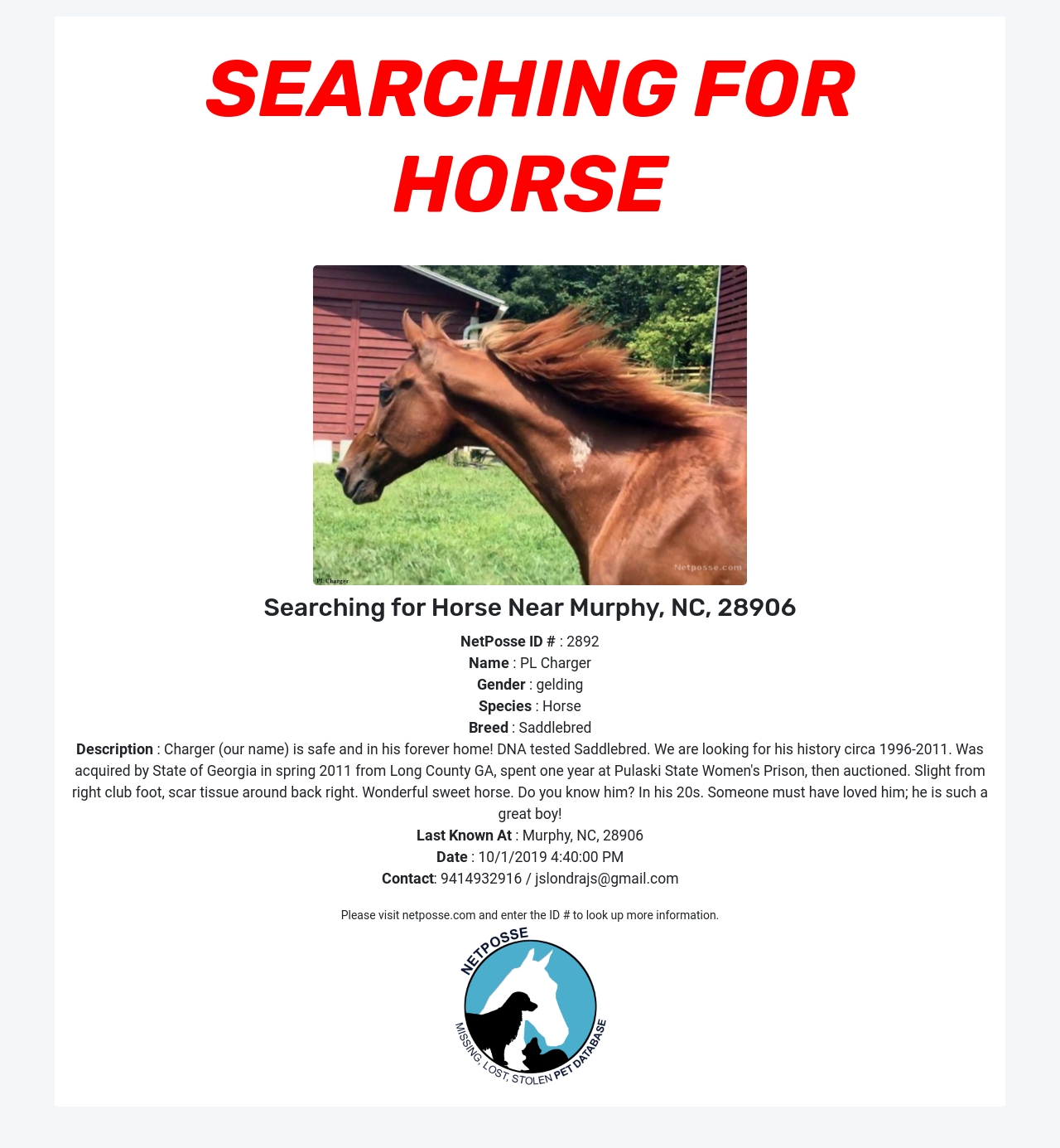 Description: Charger (our name) is safe and in his forever home! DNA tested Saddlebred. We are looking for his history circa 1996-2011. Was acquired by State of Georgia in spring 2011 from Long County GA, spent one year at Pulaski State Women's Prison, then auctioned. Slight from right club foot, scar tissue around back right. Wonderful sweet horse. Do you know him? In his 20s. Someone must have loved him; he is such a great boy!