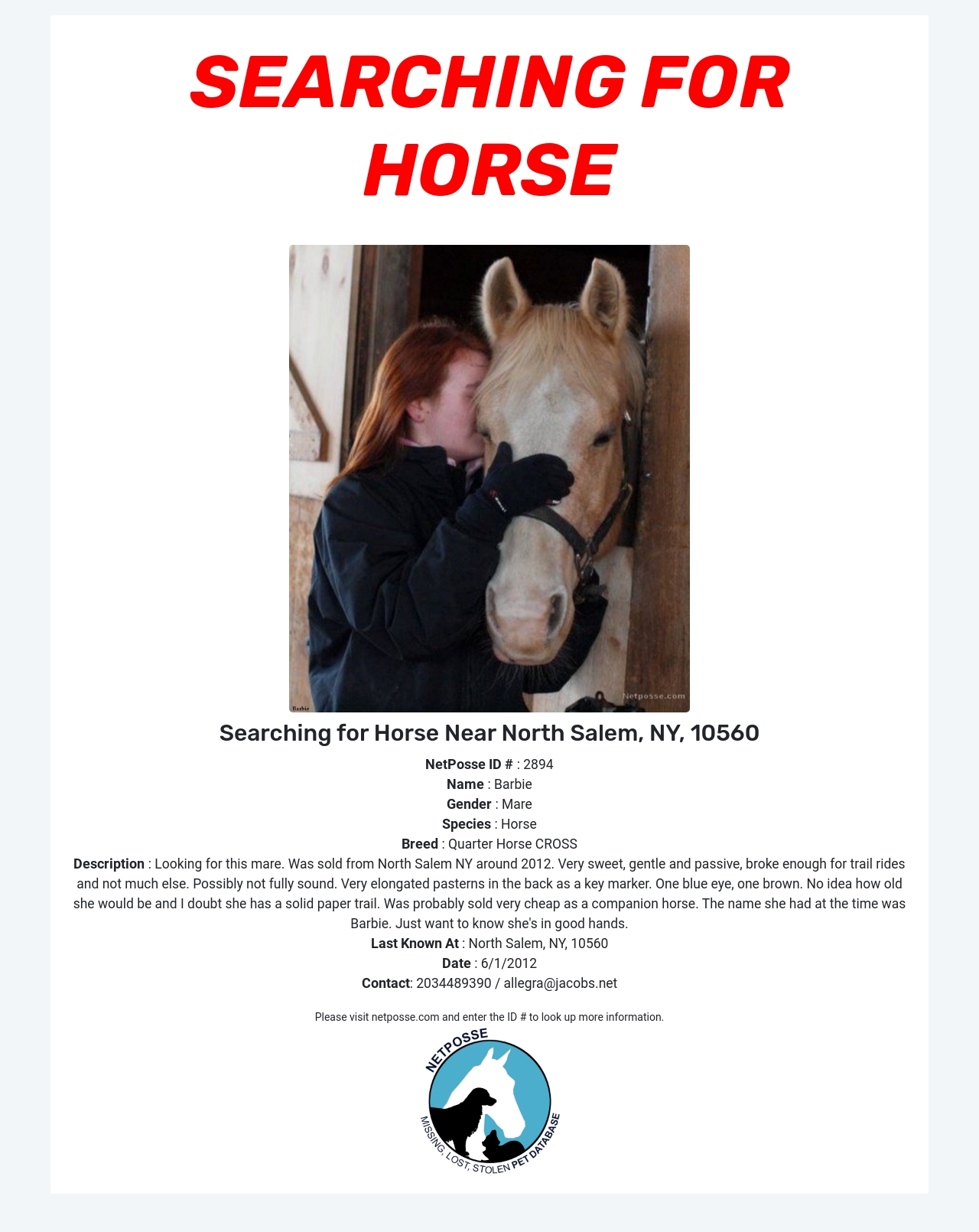 Description: Looking for this mare. Was sold from North Salem NY around 2012. Very sweet, gentle and passive, broke enough for trail rides and not much else. Possibly not fully sound. Very elongated pasterns in the back as a key marker. One blue eye, one brown. No idea how old she would be and I doubt she has a solid paper trail. Was probably sold very cheap as a companion horse. The name she had at the time was Barbie. Just want to know she's in good hands.