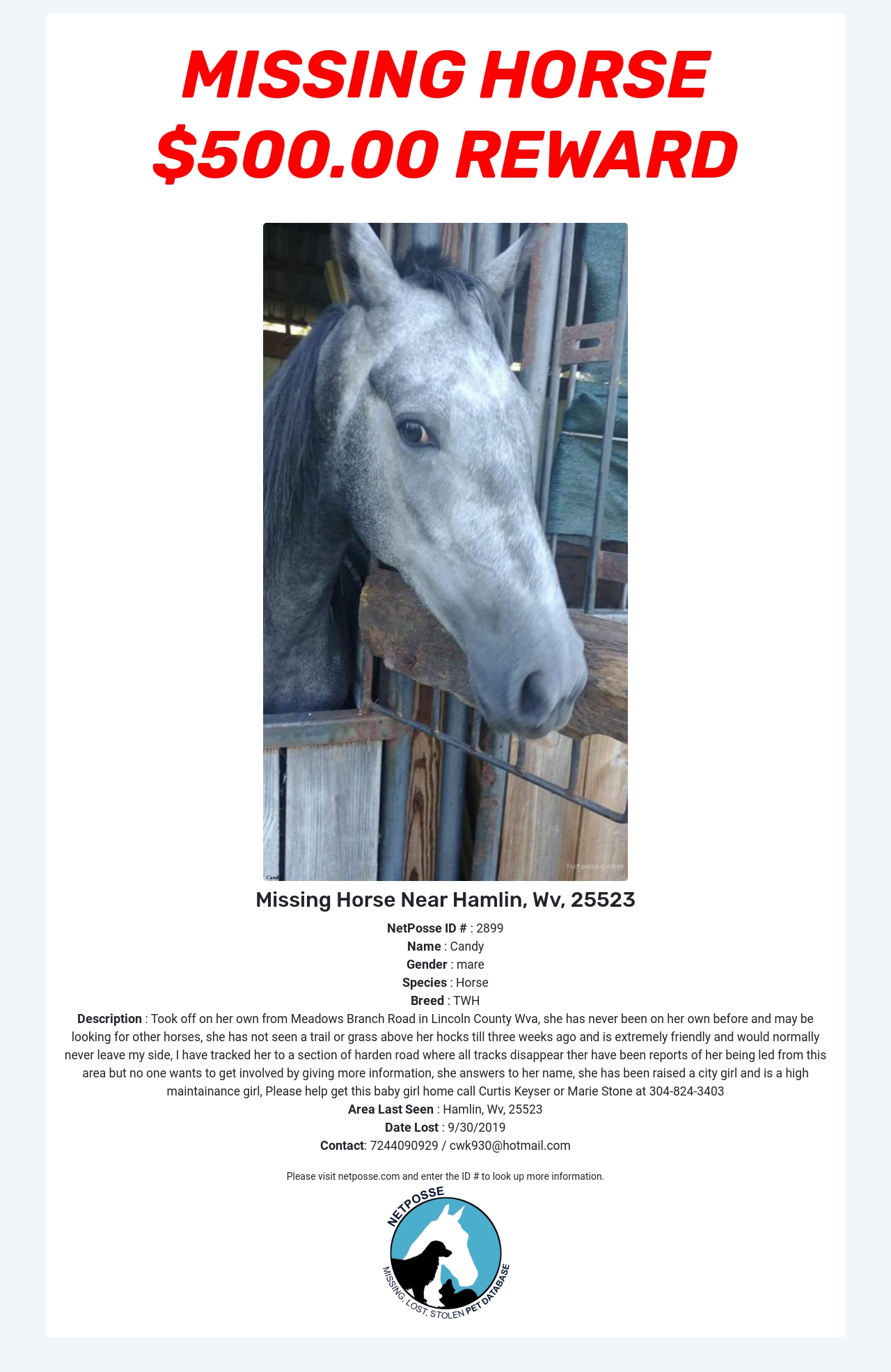 Description: Took off on her own from Meadows Branch Road in Lincoln County Wva, she has never been on her own before and may be looking for other horses, she has not seen a trail or grass above her hocks till three weeks ago and is extremely friendly and would normally never leave my side, I have tracked her to a section of harden road where all tracks disappear ther have been reports of her being led from this area but no one wants to get involved by giving more information, she answers to her name, she has been raised a city girl and is a high maintainance girl, Please help get this baby girl home call Curtis Keyser or Marie Stone at 304-824-3403