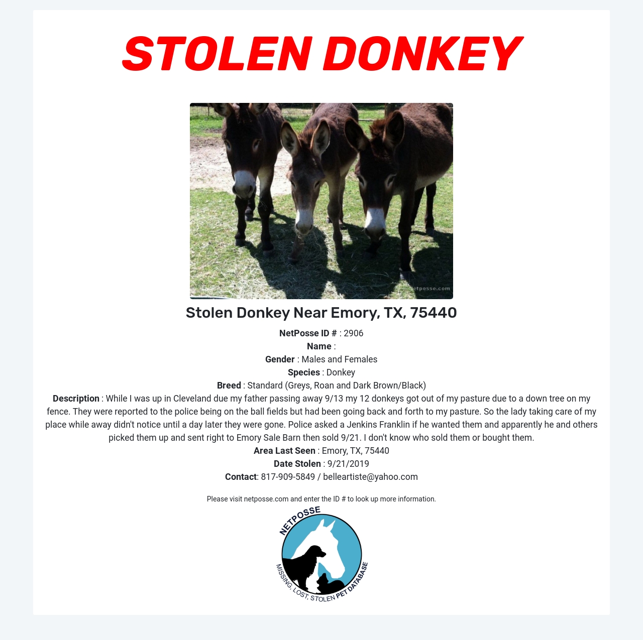 Description: While I was up in Cleveland due my father passing away 9/13 my 12 donkeys got out of my pasture due to a down tree on my fence. They were reported to the police being on the ball fields but had been going back and forth to my pasture. So the lady taking care of my place while away didn't notice until a day later they were gone. Police asked a Jenkins Franklin if he wanted them and apparently he and others picked them up and sent right to Emory Sale Barn then sold 9/21. I don't know who sold them or bought them.