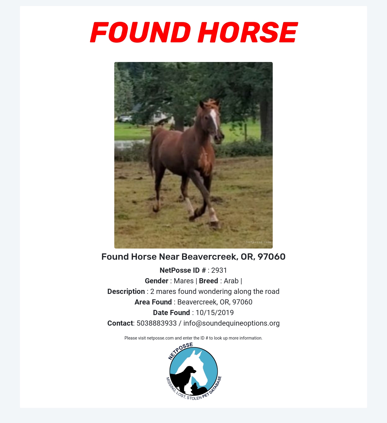 Description: 2 mares found wondering along the road