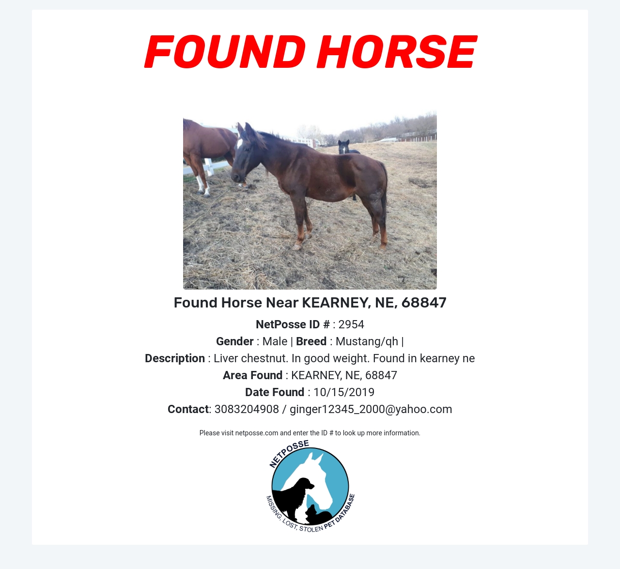 Gender: Male Species: Horse Breed: Mustang/qh Description: Liver chestnut. In good weight. Found in kearney ne Area Found: KEARNEY, NE, 68847 Date Found: 10/15/2019 Contact / Submit Tip