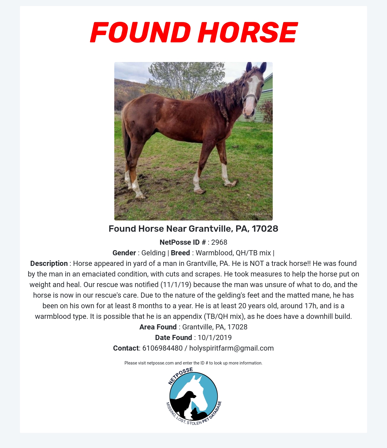 Description: Horse appeared in yard of a man in Grantville, PA. He is NOT a track horse!!