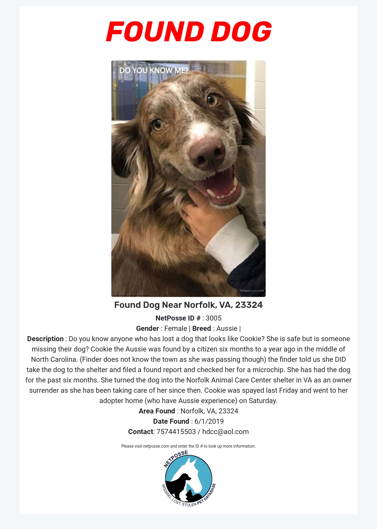 Cookie the Aussie was found by a citizen six months to a year ago in the middle of North Carolina. (Finder does not know the town as she was passing though) the finder told us she DID take the dog to the shelter and filed a found report and checked her for a microchip. She has had the dog for the past six months. She turned the dog into the Norfolk Animal Care Center shelter in VA as an owner surrender as she has been taking care of her since then. Cookie was spayed last Friday and went to her adopter home (who have Aussie experience) on Saturday.