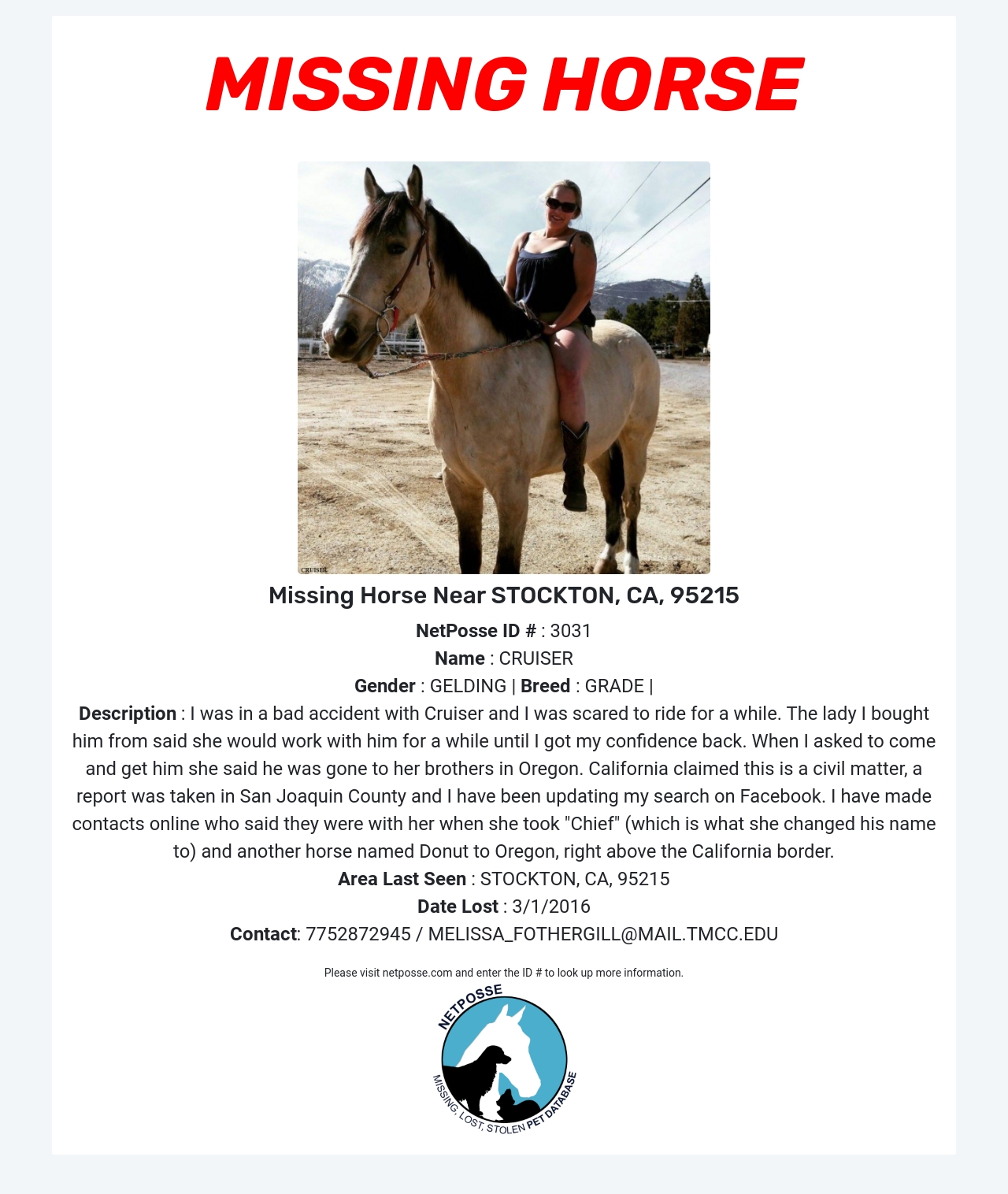 Description: I was in a bad accident with Cruiser and I was scared to ride for a while. The lady I bought him from said she would work with him for a while until I got my confidence back. When I asked to come and get him she said he was gone to her brothers in Oregon. California claimed this is a civil matter, a report was taken in San Joaquin County and I have been updating my search on Facebook. I have made contacts online who said they were with her when she took "Chief" (which is what she changed his name to) and another horse named Donut to Oregon, right above the California border.