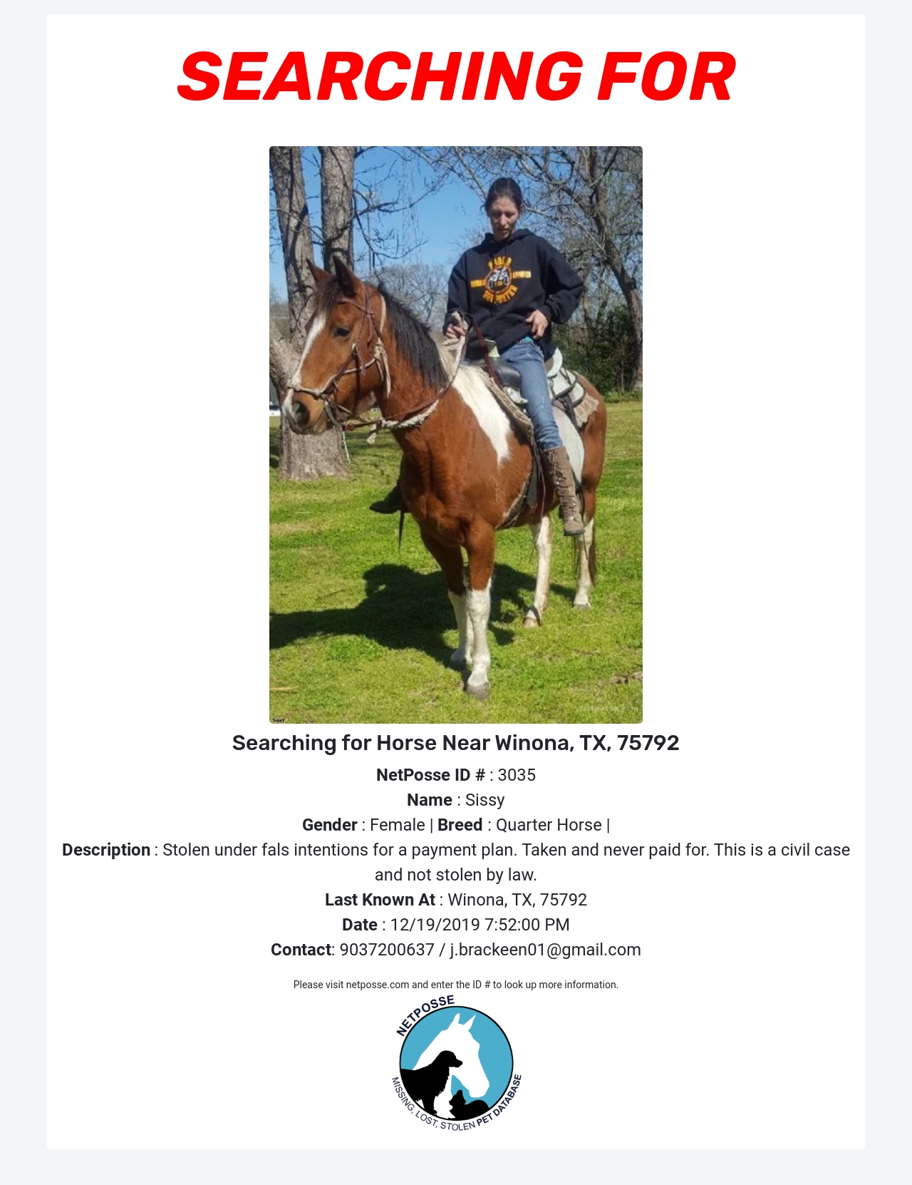 Area Last Seen: Winona, TX, 75792