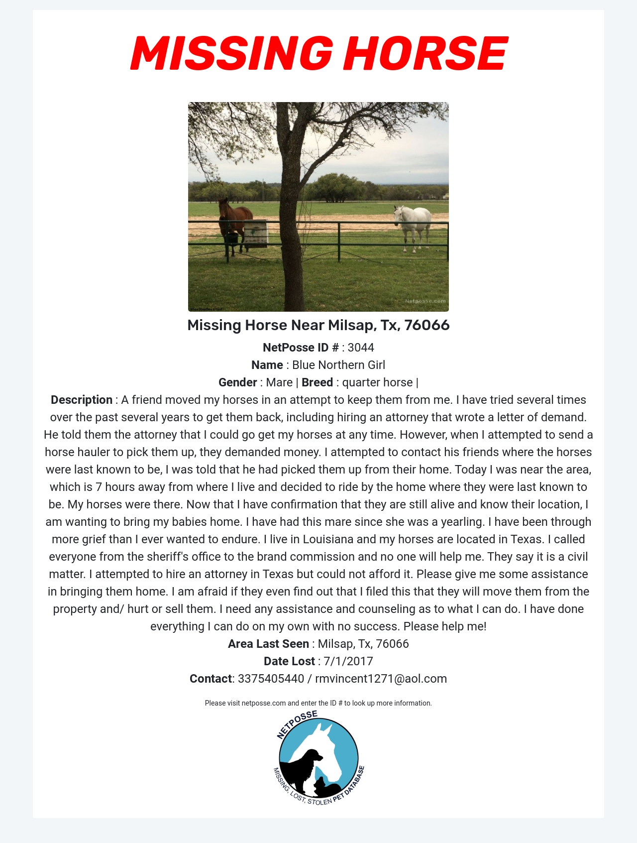 Description: A friend moved my horses in an attempt to keep them from me. I have tried several times over the past several years to get them back, including hiring an attorney that wrote a letter of demand. He told them the attorney that I could go get my horses at any time. However, when I attempted to send a horse hauler to pick them up, they demanded money. I attempted to contact his friends where the horses were last known to be, I was told that he had picked them up from their home. Today I was near the area, which is 7 hours away from where I live and decided to ride by the home where they were last known to be. My horses were there. Now that I have confirmation that they are still alive and know their location, I am wanting to bring my babies home. I have had this mare since she was a yearling. I have been through more grief than I ever wanted to endure. I live in Louisiana and my horses are located in Texas. I called everyone from the sheriff's office to the brand commission and no one will help me. They say it is a civil matter. I attempted to hire an attorney in Texas but could not afford it. Please give me some assistance in bringing them home. I am afraid if they even find out that I filed this that they will move them from the property and/ hurt or sell them. I need any assistance and counseling as to what I can do. I have done everything I can do on my own with no success. Please help me!