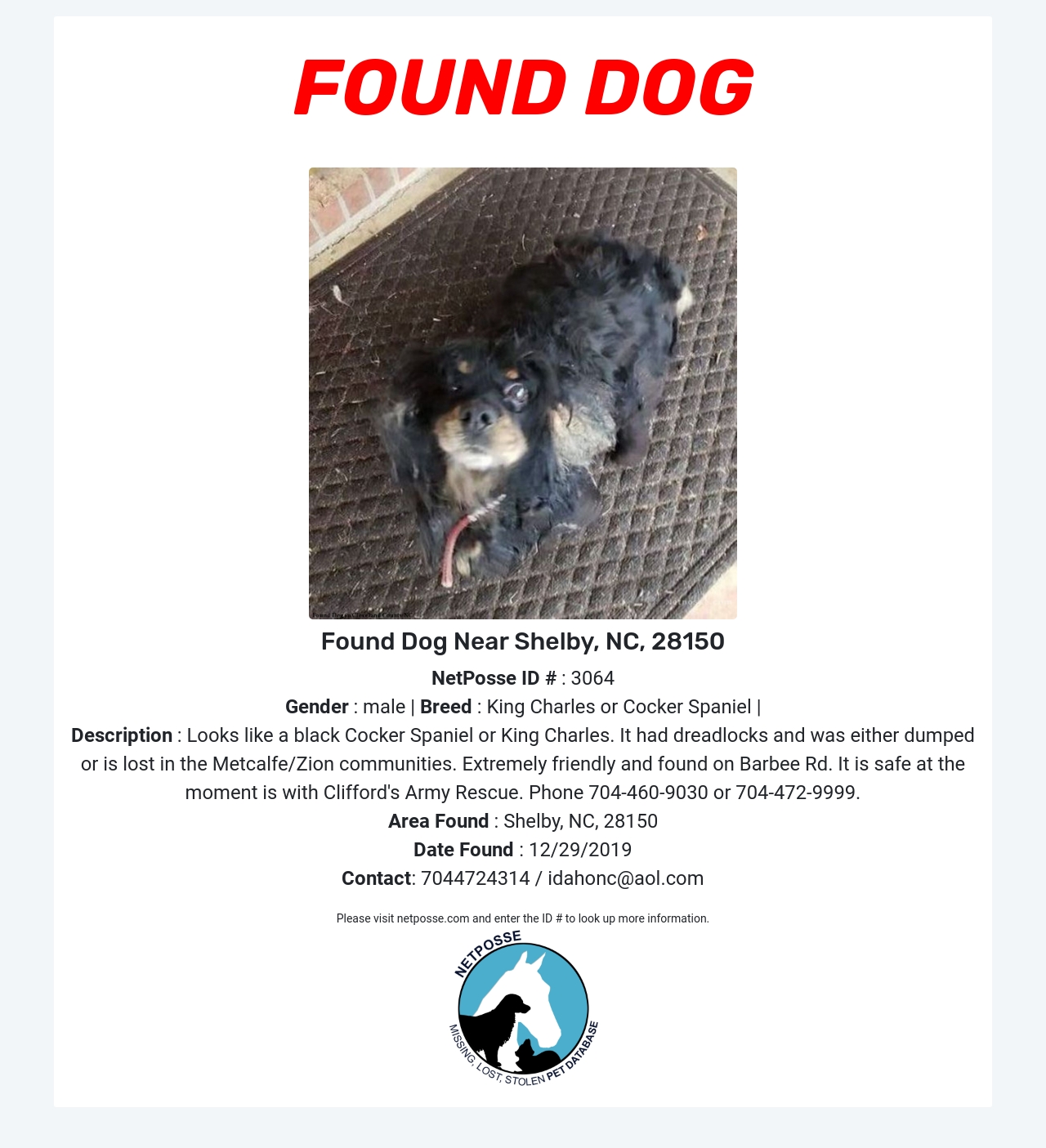 Description: Looks like a black Cocker Spaniel or King Charles. It had dreadlocks and was either dumped or is lost in the Metcalfe/Zion communities. Extremely friendly and found on Barbee Rd. It is safe at the moment is with Clifford's Army Rescue. Phone 704-460-9030 or 704-472-9999.