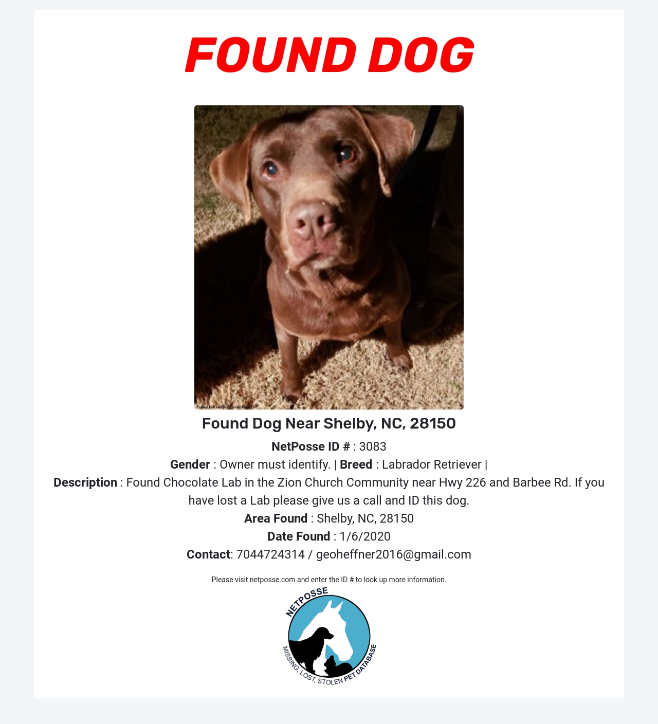 Description: Found Chocolate Lab in the Zion Church Community near Hwy 226 and Barbee Rd. If you have lost a Lab please give us a call and ID this dog.