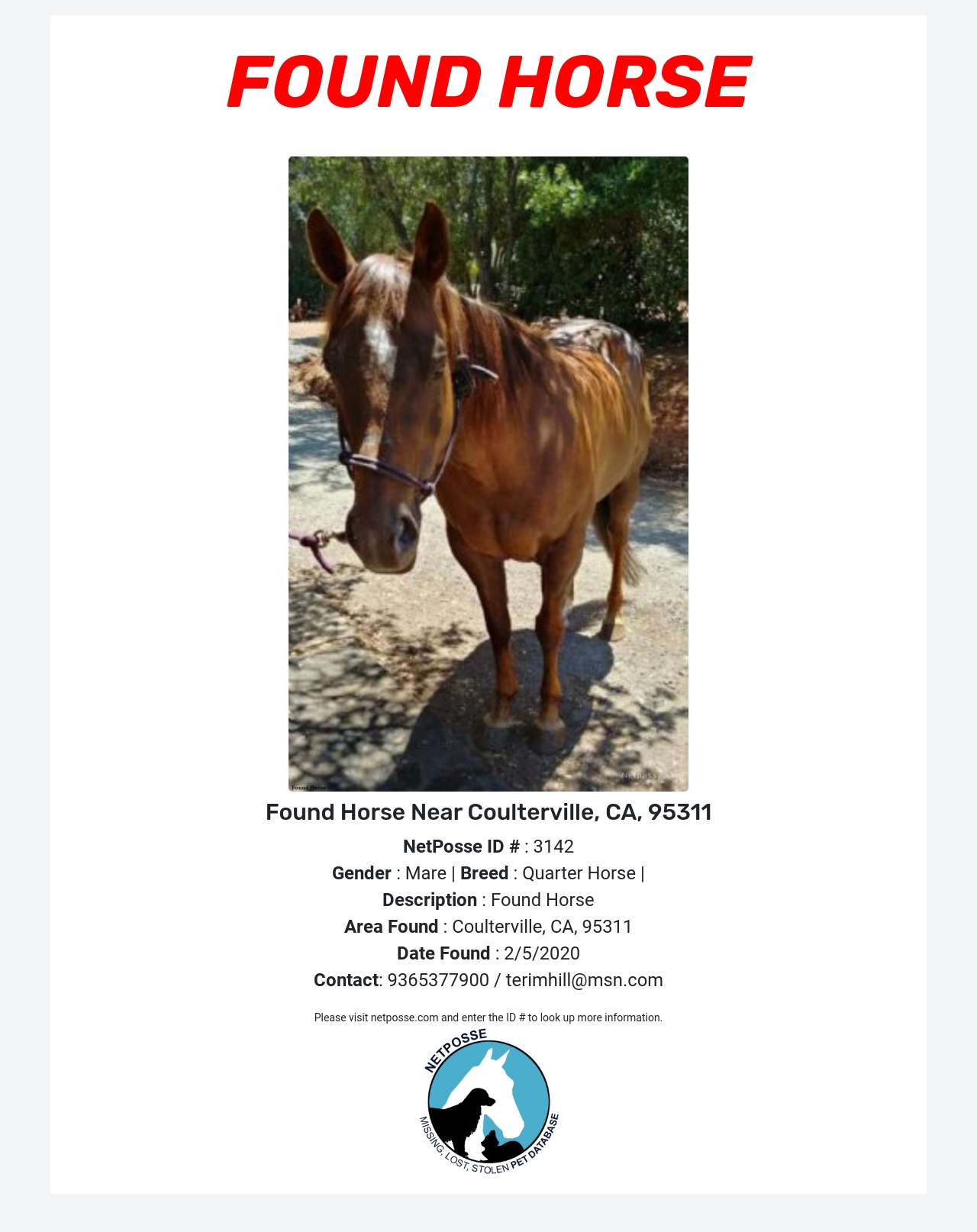 Gender: Mare Species: Horse Breed: Quarter Horse Description: Found Horse Area Found: Coulterville, CA, 95311 Date Found: 2/5/2020 Contact / Submit Tip