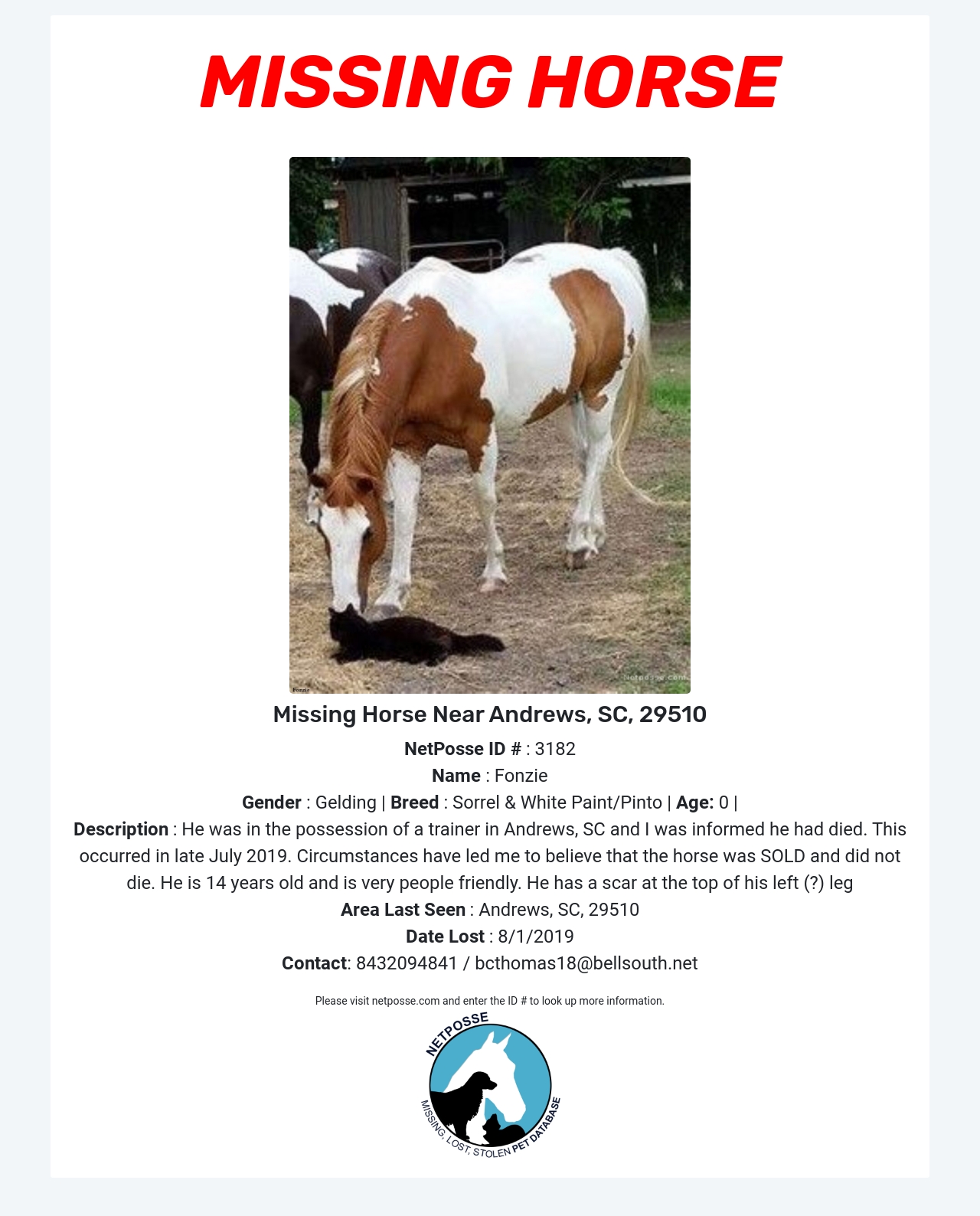 Description: He was in the possession of a trainer in Andrews, SC and I was informed he had died. This occurred in late July 2019. Circumstances have led me to believe that the horse was SOLD and did not die. He is 14 years old and is very people friendly. He has a scar at the top of his left (?) leg