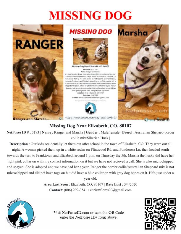 Description: Our kids accidentally let them out after school in the town of Elizabeth, CO. They were out all night. A woman picked them up in a white sedan on Flintwood Rd. and Ponderosa Ln. Then, I headed south towards the turn to Franktown and Elizabeth around 1 p.m. on Thursday the 5th. Marsha, the husky, did have her light pink collar on with my contact information on it, but we have not received a call. She is also microchipped and spayed. She is adopted and we have had her a year. Ranger, the border collie/Australian Sheppard mix, is not microchipped and did not have tags on but did have a blue collar with gray dog bones on it. He's just under a year old. Download, print, and post this PDF flyer from here. https://netposse.com/?3193