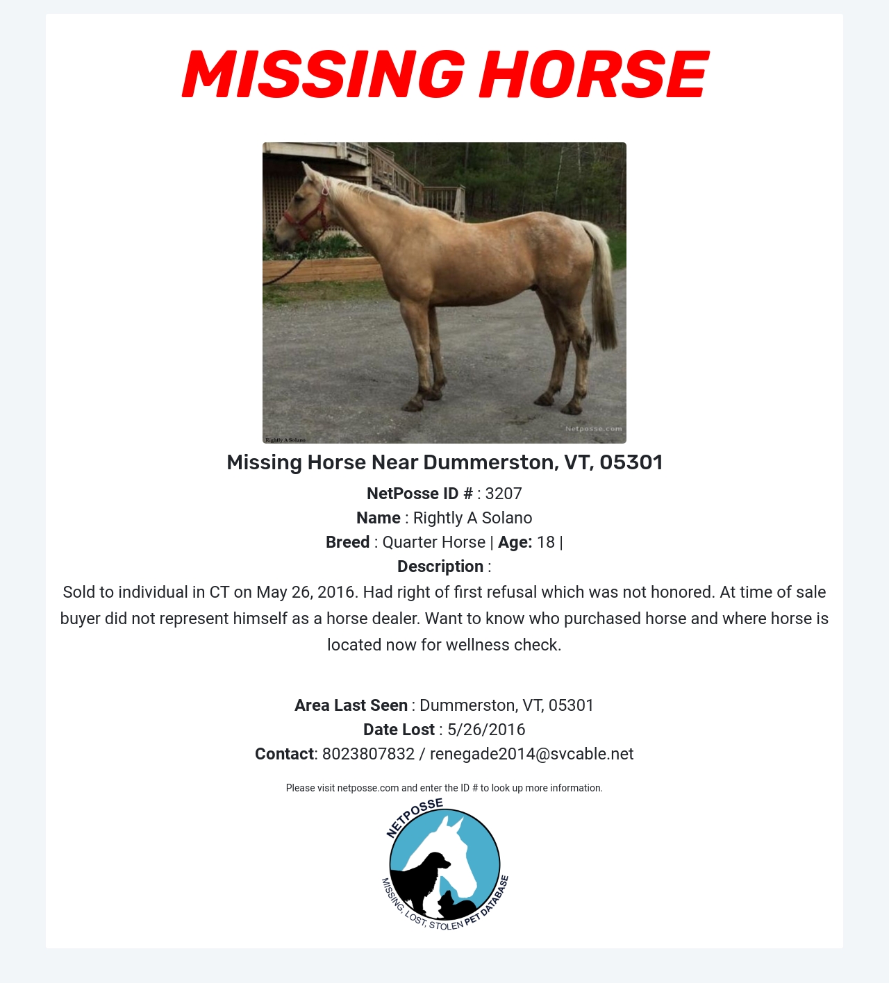 Description: Sold to individual in CT on May 26, 2016. Had right of first refusal which was not honored. At time of sale buyer did not represent himself as a horse dealer. Want to know who purchased horse and where horse is located now for wellness check.