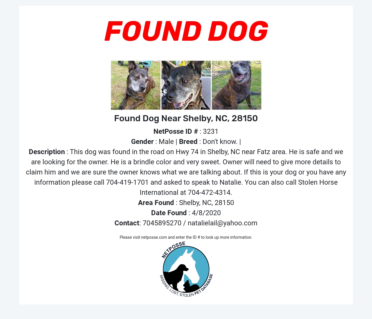 If this is your dog or you have any information please call 704-419-1701 and asked to speak to Natalie. You can also call Stolen Horse International at 704-472-4314.