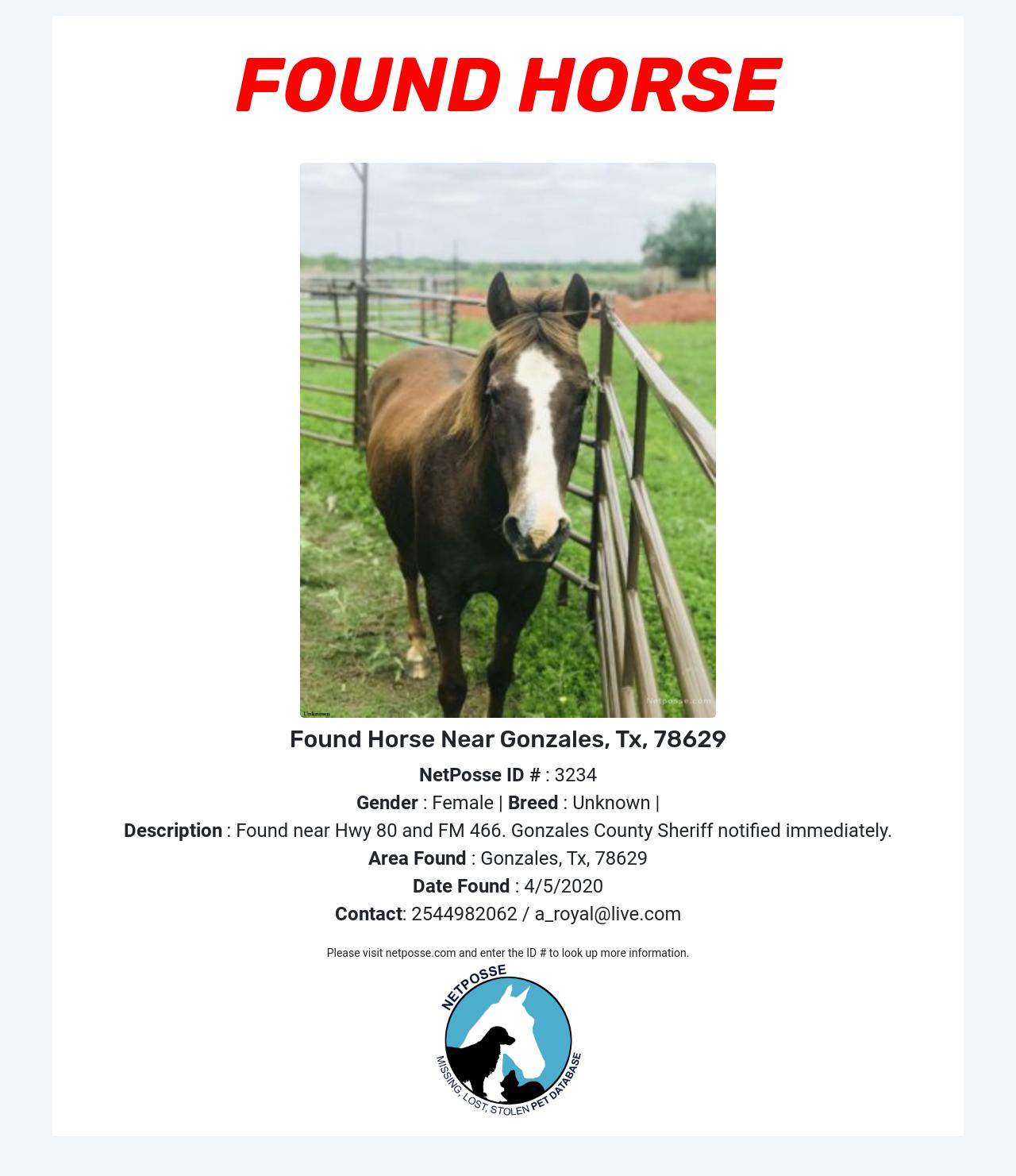 Description: Found near Hwy 80 and FM 466. Gonzales County Sheriff notified immediately.