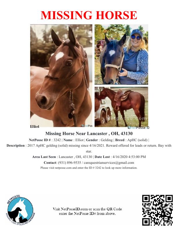 Elliot was taken from his stall between 9pm and 7am on 4/16/20 blanket was removed before he was taken. It is believed that it was a previous owner. He was taken from Lancaster Ohio.