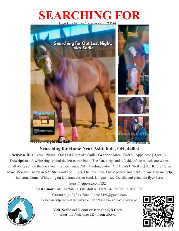 Description: Have you seen this horse?? Praying for a miracle and for honesty from people who know the truth. Need all horse warriors never to forget that Sadie is still out there waiting for me to bring her home. Only with your help will this be accomplished. It's been since 2015. Finding Sadie. (OUT LAST NIGHT.) ApHC big Halter Mare. Reserve Champ in NY. She would be 13 yrs, I believe now. I have papers and DNA. Please help me help her come home. White ring on left front cornet band. Unique blaze.