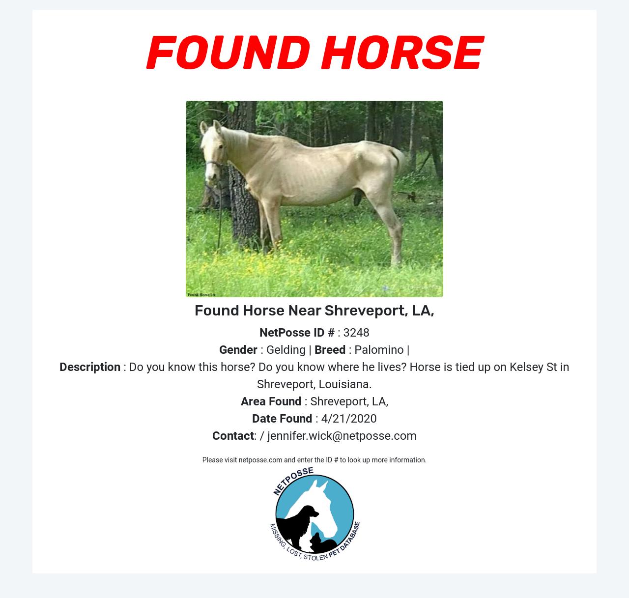 Description: Do you know this horse? Do you know where he lives? Horse is tied up on Kelsey St in Shreveport, Louisiana.