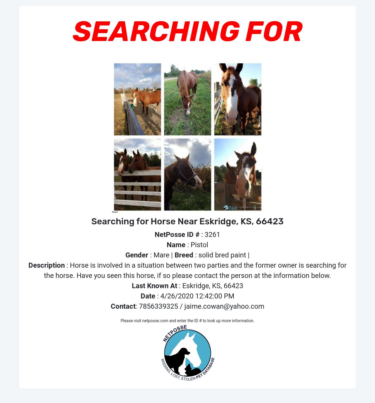 Description: Horse is involved in a situation between two parties and the former owner is searching for the horse. Have you seen this horse, if so please contact the person at the information below.