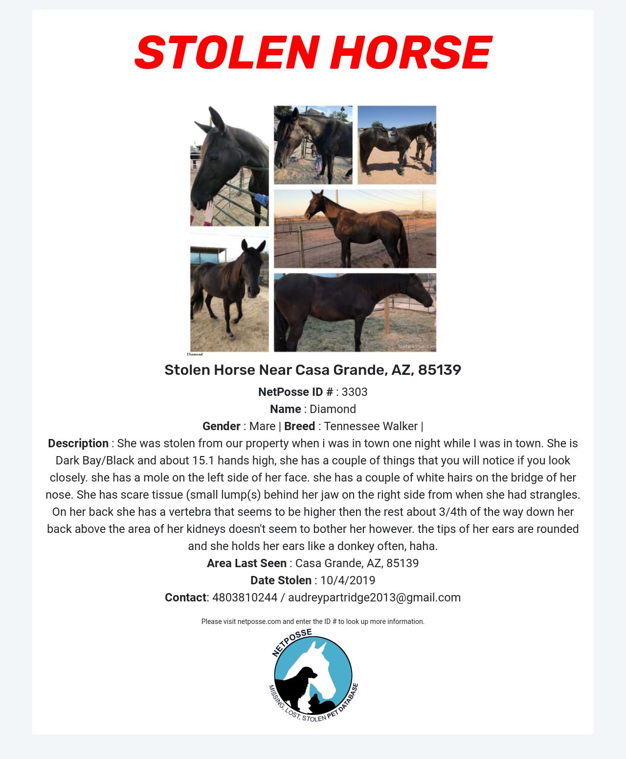 Description: She was stolen from our property when i was in town one night while I was in town. She is Dark Bay/Black and about 15.1 hands high, she has a couple of things that you will notice if you look closely. she has a mole on the left side of her face. she has a couple of white hairs on the bridge of her nose. She has scare tissue (small lump(s) behind her jaw on the right side from when she had strangles. On her back she has a vertebra that seems to be higher then the rest about 3/4th of the way down her back above the area of her kidneys doesn't seem to bother her however. the tips of her ears are rounded and she holds her ears like a donkey often, haha.