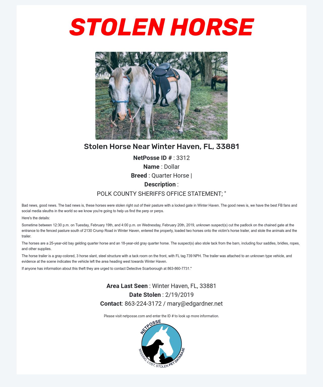 Sometime between 12:30 p.m. on Tuesday, February 19th, and 4:00 p.m. on Wednesday, February 20th, 2019, unknown suspect(s) cut the padlock on the chained gate at the entrance to the fenced pasture south of 2130 Crump Road in Winter Haven, entered the property, loaded two horses onto the victim's horse trailer, and stole the animals and the trailer.