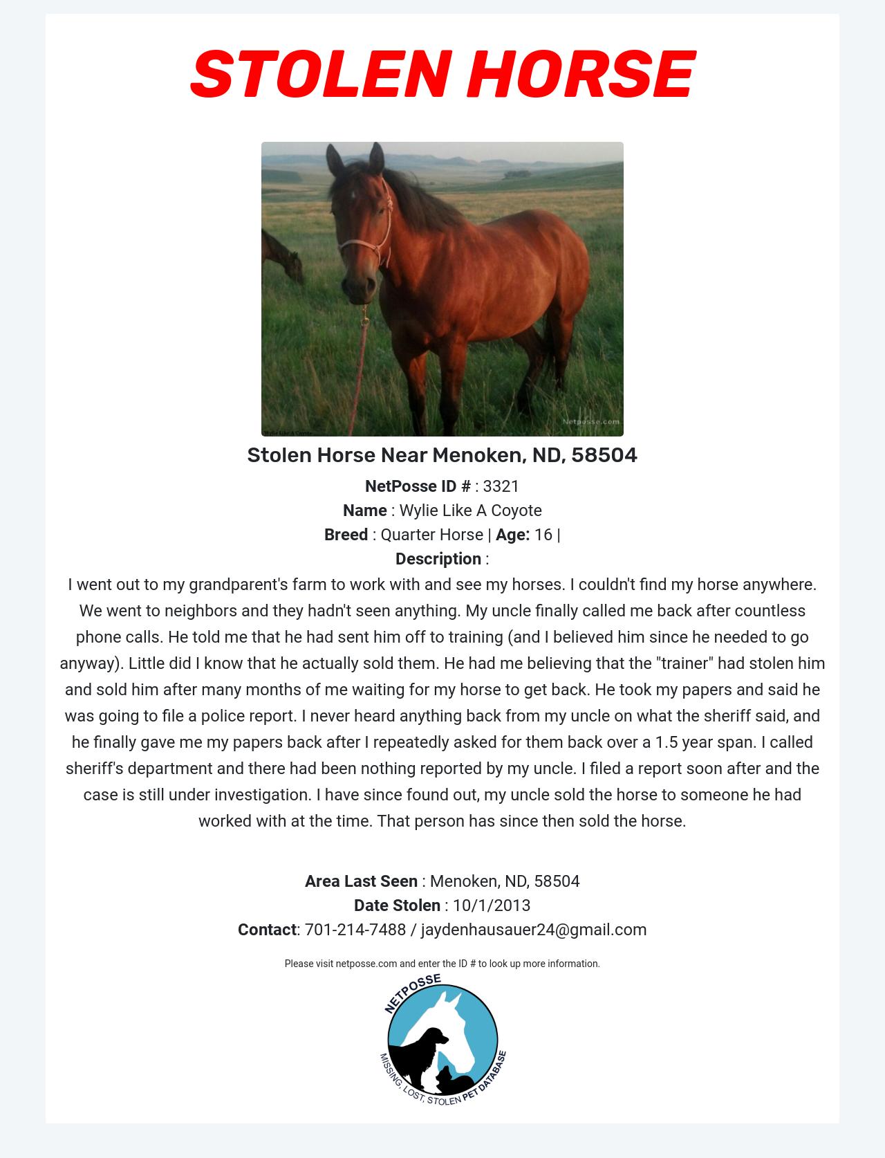 Stolen Horse named Wylie Like A Coyote - Menoken, ND, 58504 #3321
