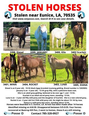 Description: Diana is a wild pony bay mare, standing about 13 hh. She was pasture boarded at a ranch south of Eunice, Louisiana. The landowner has been arrested on 7 counts of livestock theft, after 14 horses were identified as missing on June 6th. It is believed they disappeared between May 5th and May 25th. 4 of the missing horses were recovered from the Bastrop kill pen, 2 made it out of the slaughter pipeline into private homes, but 8 are still missing including Diana.
